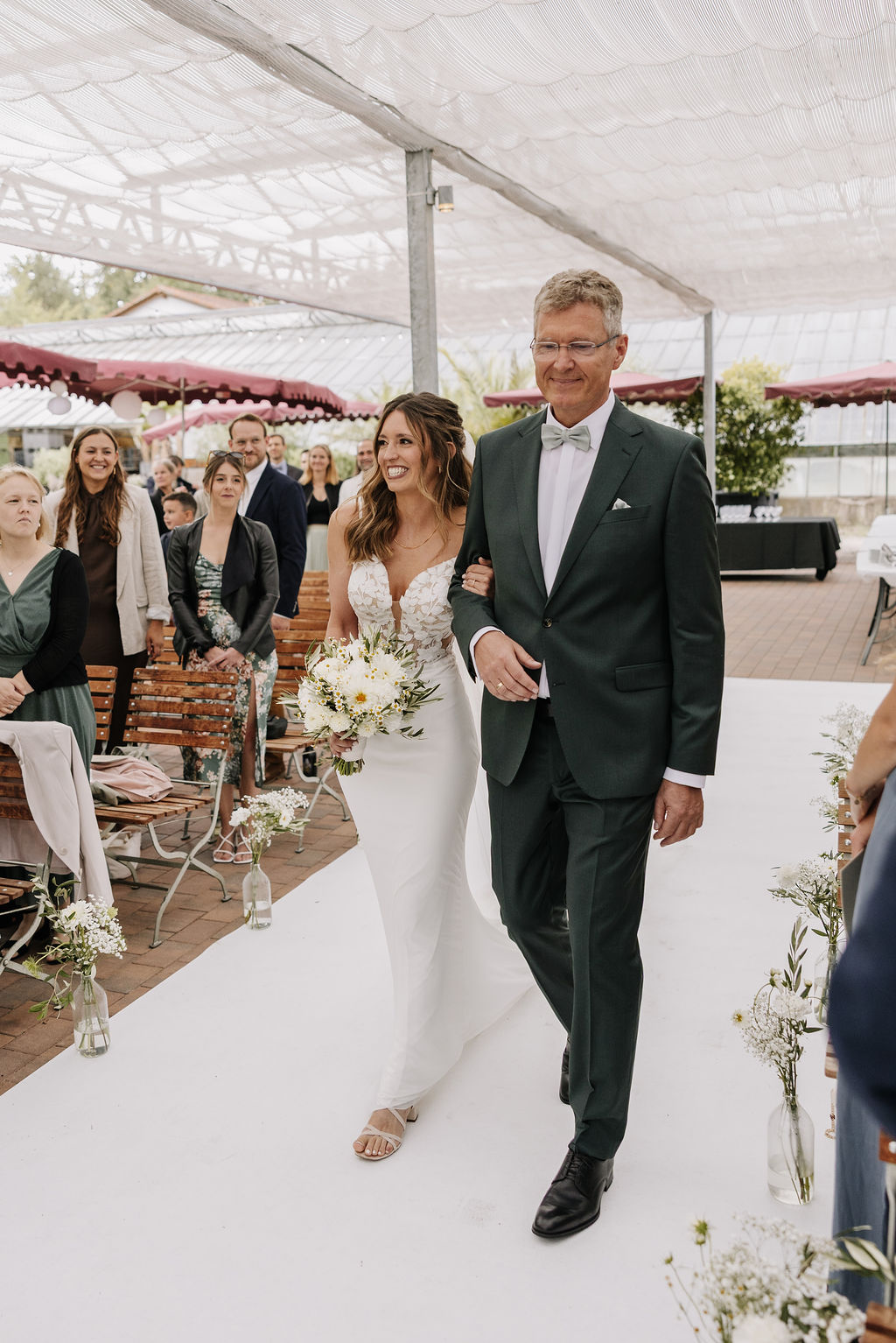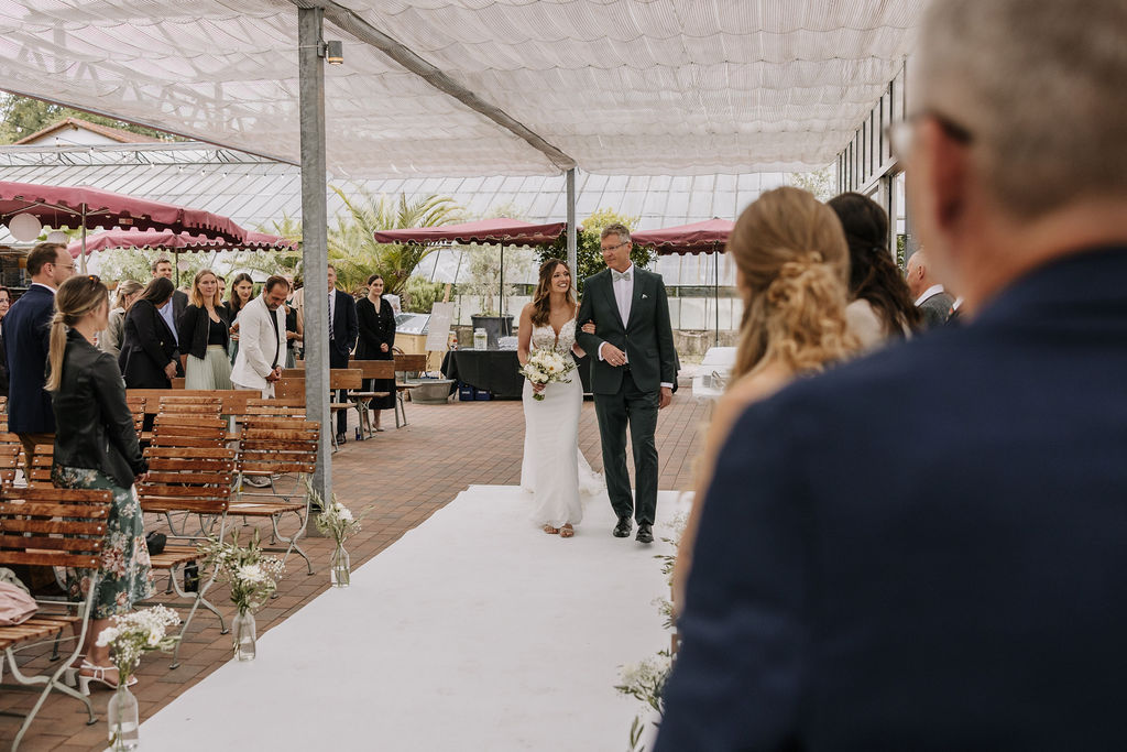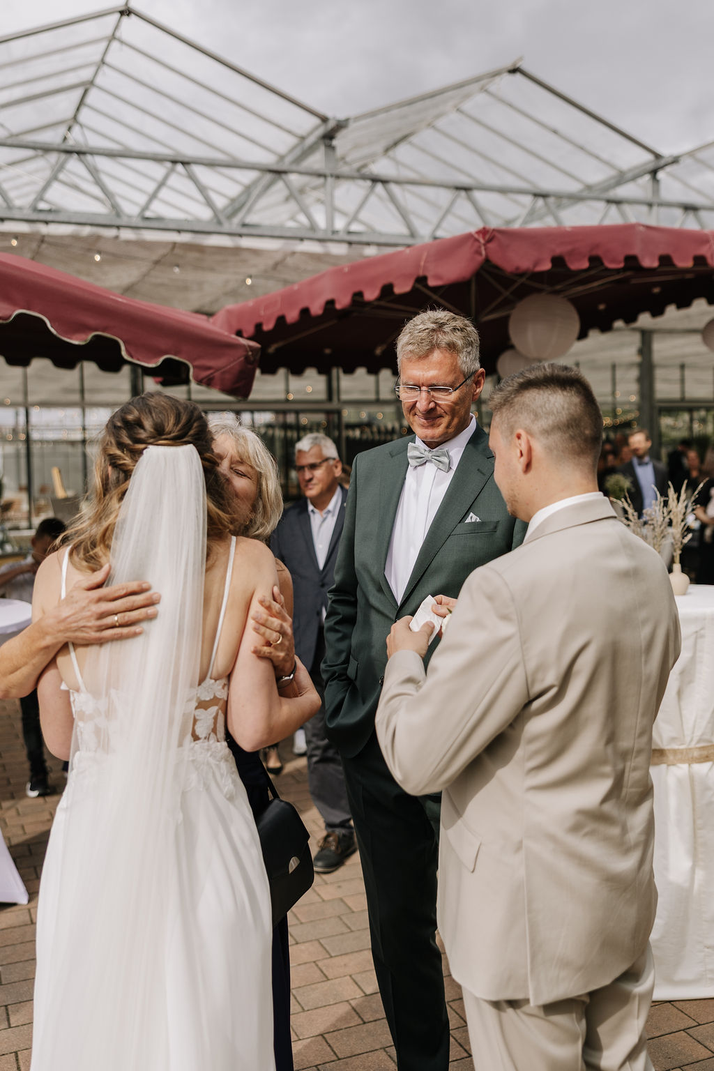 Die Trauung und anschließende Feier fanden im Gewächshaus der Gärtnerei Schecker statt – eine außergewöhnliche Gewächshaus Hochzeitslocation mit ganz besonderem Charme. Umgeben von Pflanzen, Licht und natürlicher Atmosphäre gaben sich Felix und Birte ihr Ja-Wort.