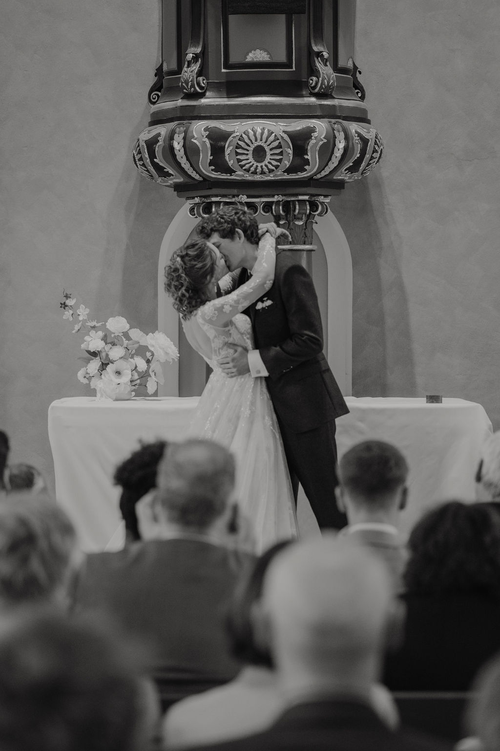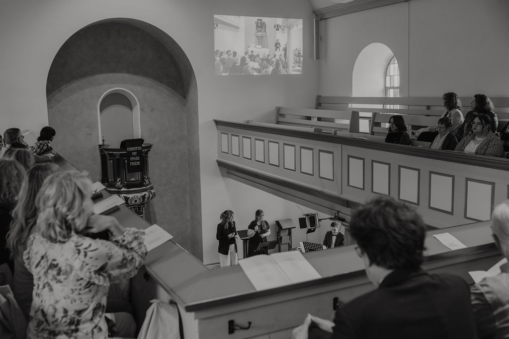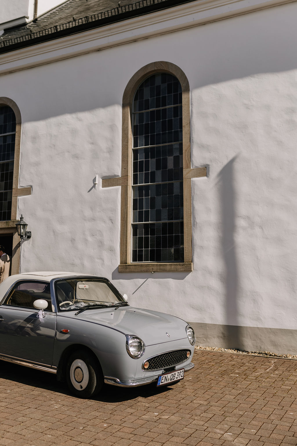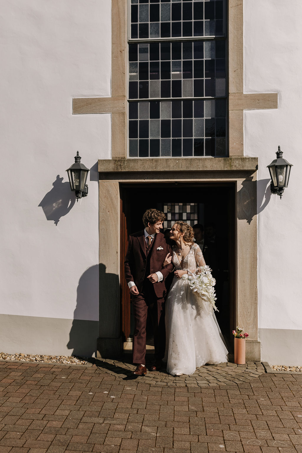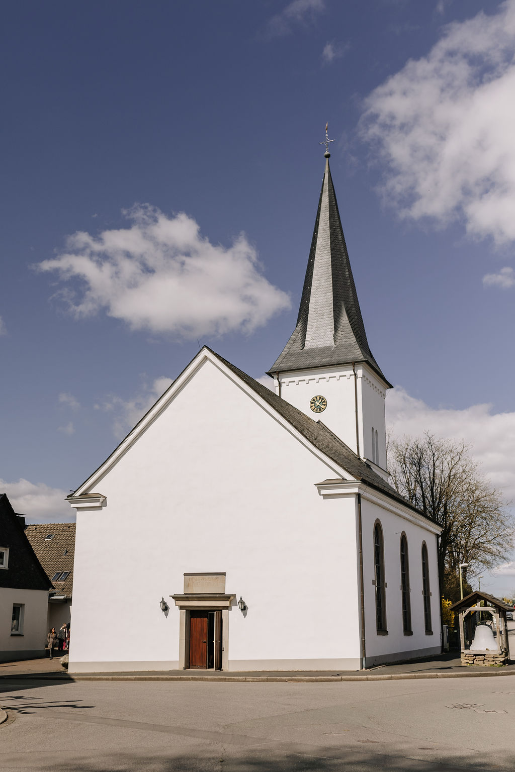 Nach dem First Look ging es weiter zur kirchlichen Trauung in der Evangelischen Kirchengemeinde Rüggeberg in Ennepetal. Die Kirche bietet einen hellen, schlichten Rahmen, der Raum für Emotionen lässt. Die Trauung war persönlich, ruhig und getragen von Familie und Freunden – genau die Art von Zeremonie, bei der echte Momente ganz selbstverständlich entstehen.