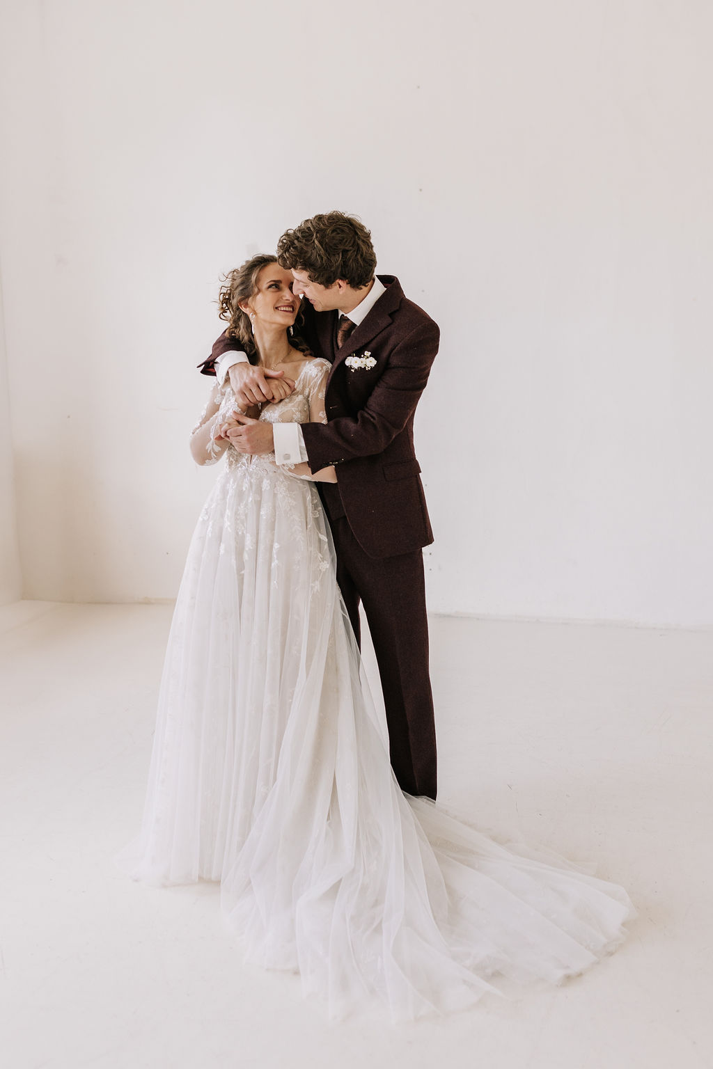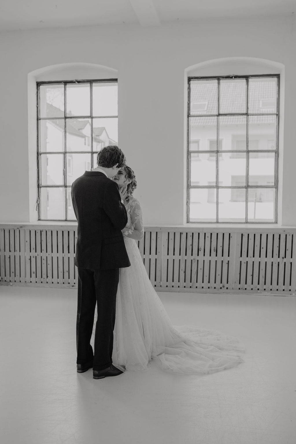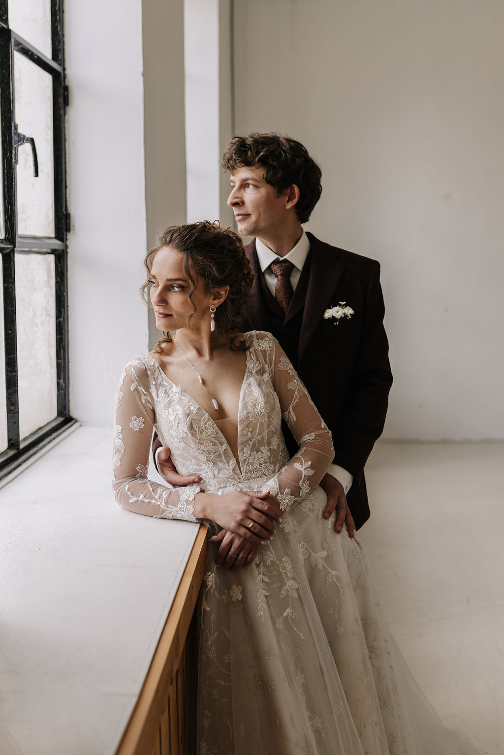 Für das First Look Shooting entschieden wir uns für das Studio The Cotton Mill in Wuppertal. Die warme, ruhige Atmosphäre des Studios bot ideale Bedingungen, um ganz ohne Zeitdruck anzukommen. Statt Kälte und Hektik entstand ein intimer Moment nur für die beiden – geschützt, konzentriert und voller Vorfreude.