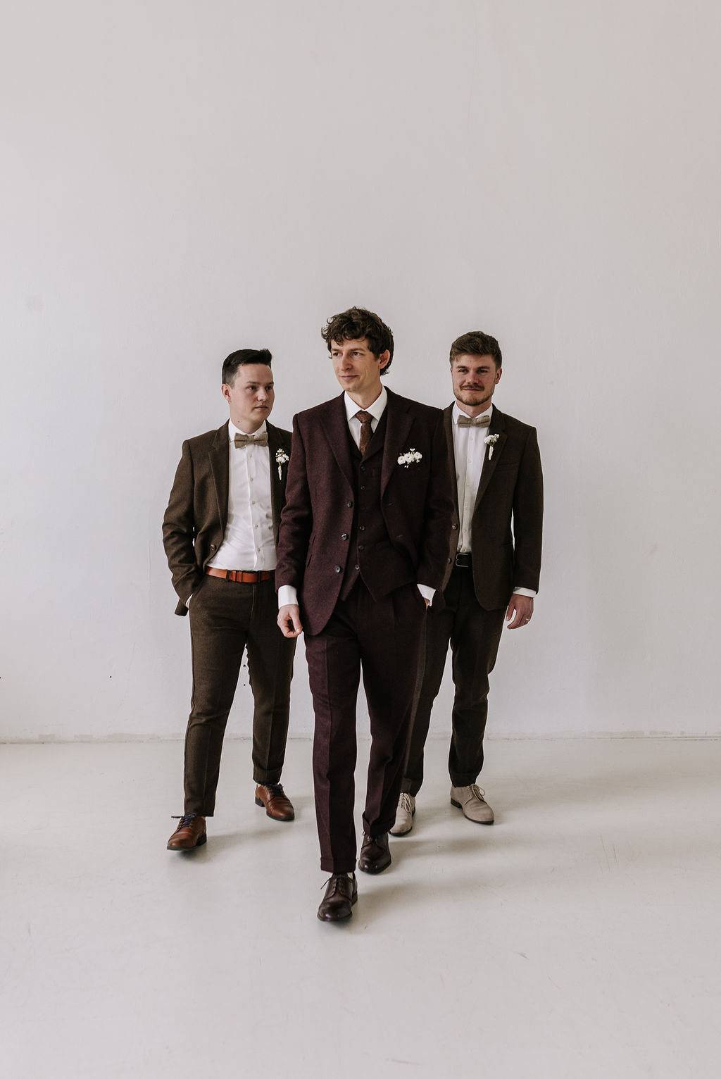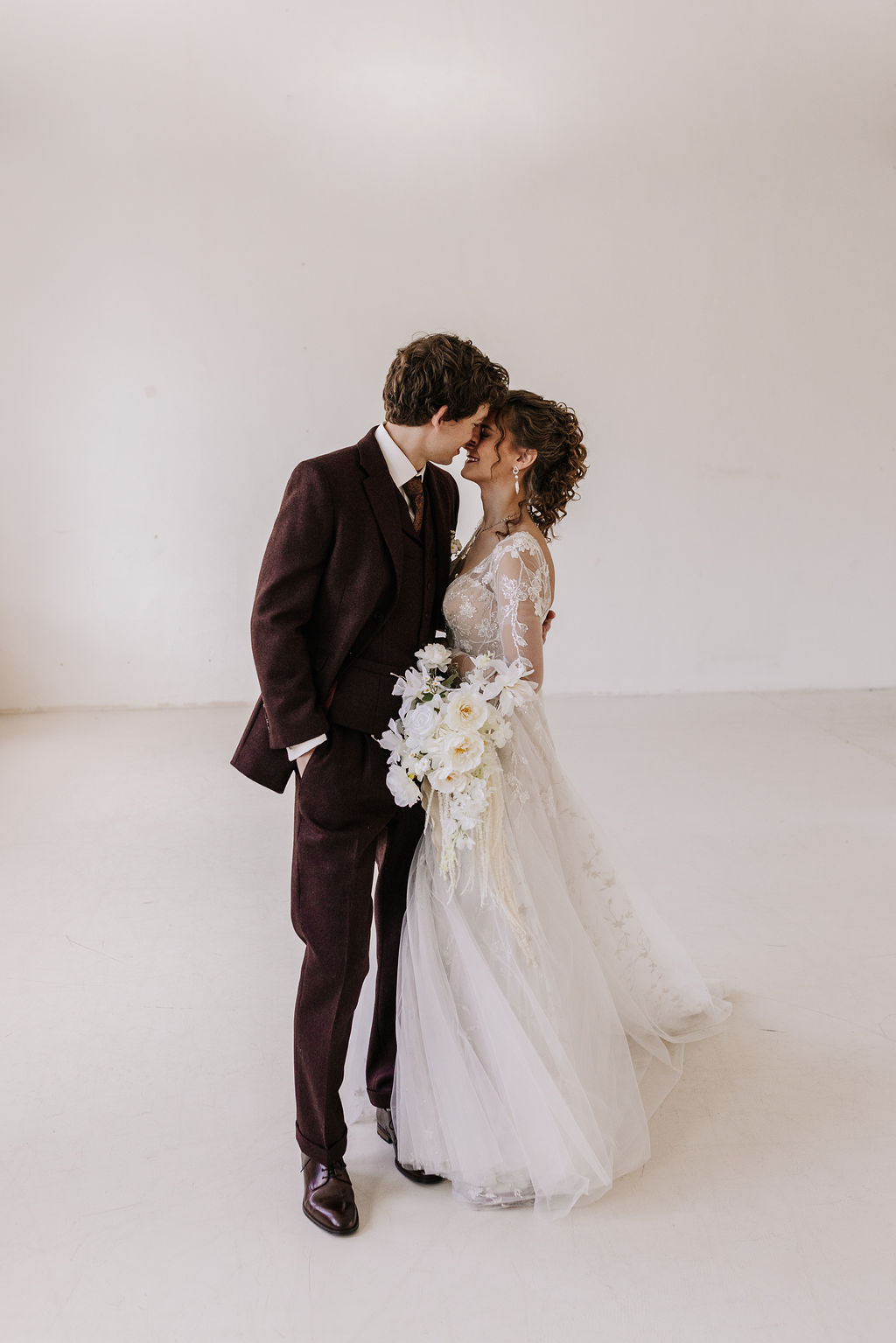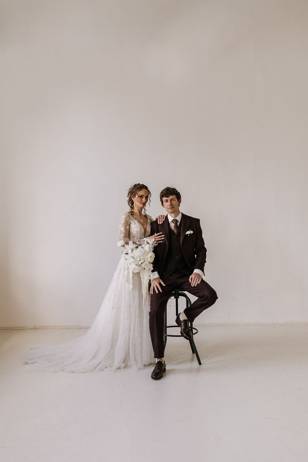 Der Look des Shootings war modern und editorial: klare Linien, reduzierte Farben und ein Fokus auf Ausdruck statt Inszenierung. Das Studio eignete sich perfekt für zeitlose Hochzeitsfotos, die nicht von Trends leben, sondern von Stimmung und Nähe. Eine Entscheidung, die den Bildern Ruhe und Tiefe verliehen hat.