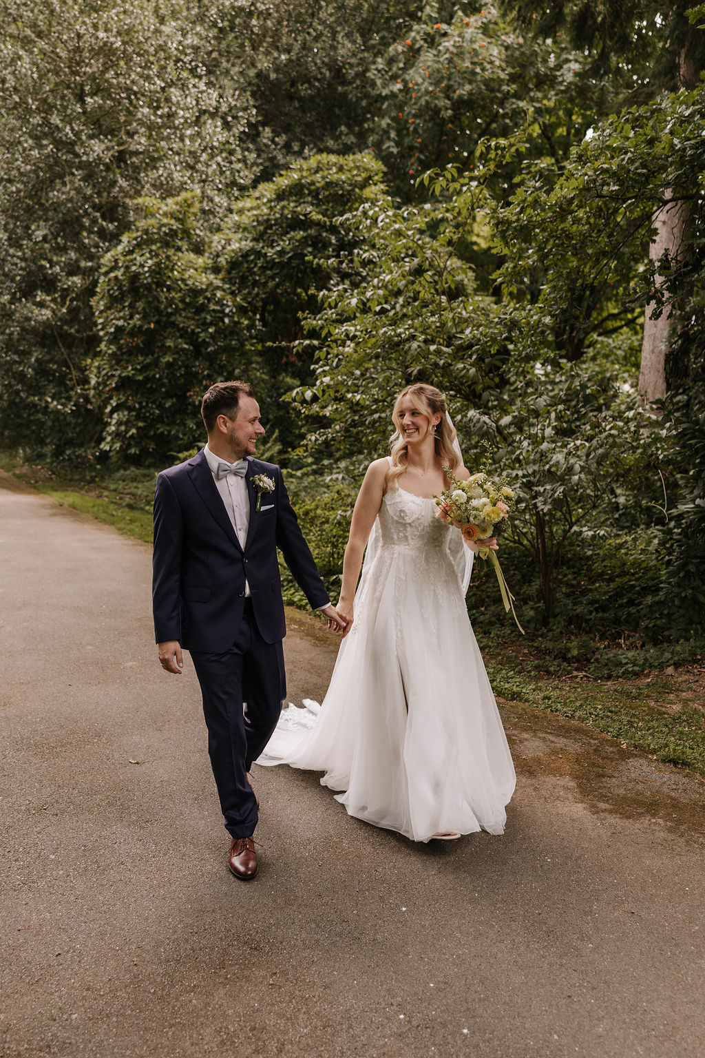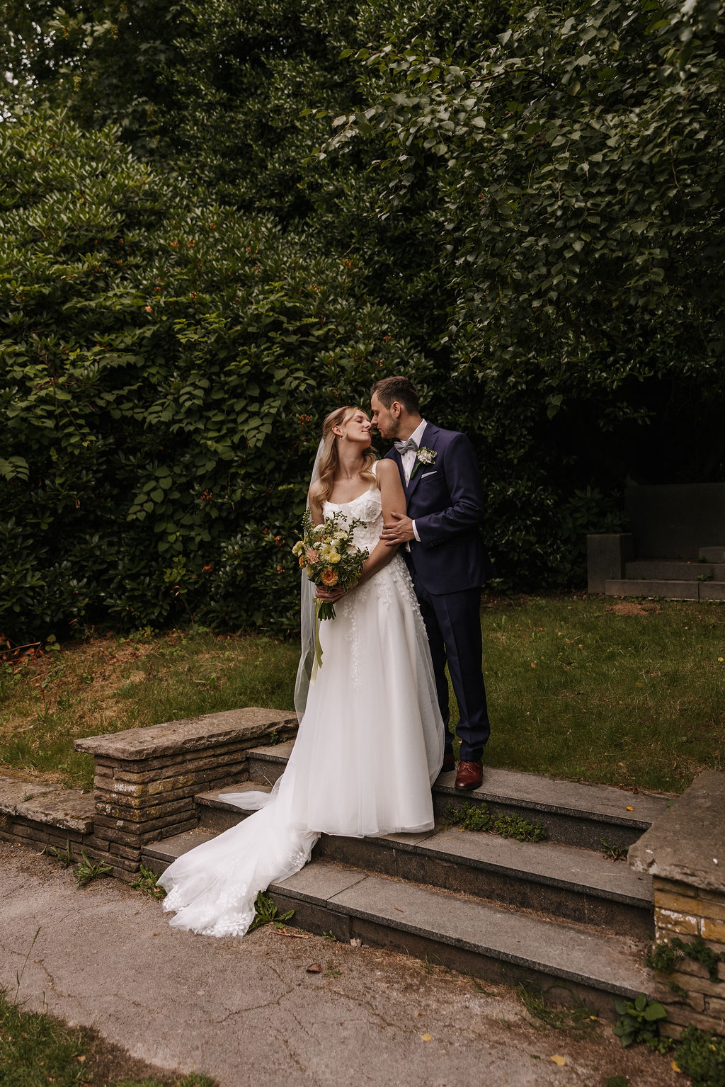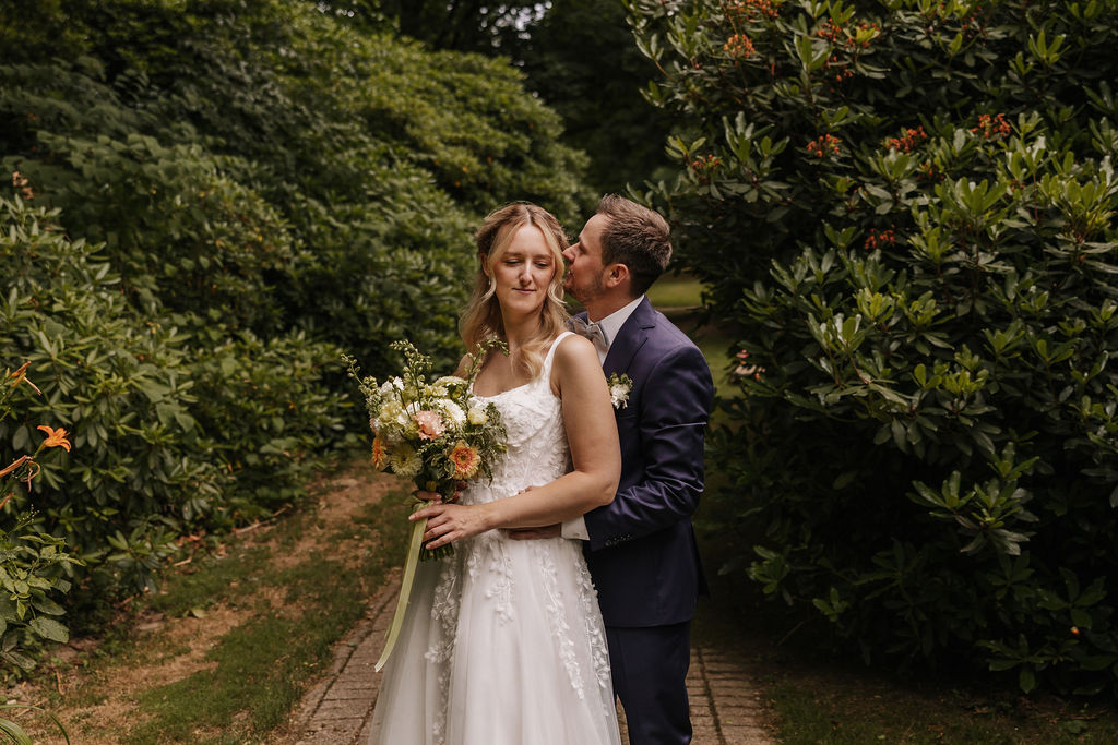 Vor der Trauung ging es für das Brautpaar zum Fotoshooting in den Botanischen Garten Solingen. Diese Location bietet eine wunderbare Abwechslung zur Kirche: viel Grün, natürliche Strukturen und ruhige Ecken, die Raum für intime Paarmomente schaffen. Besonders für zeitlose Hochzeitsfotos ist der Botanische Garten in Solingen eine beliebte Wahl. Zwischen Bäumen, Wegen und offenen Flächen entstanden natürliche, entspannte Bilder, die die Nähe und Leichtigkeit des Paares widerspiegeln.