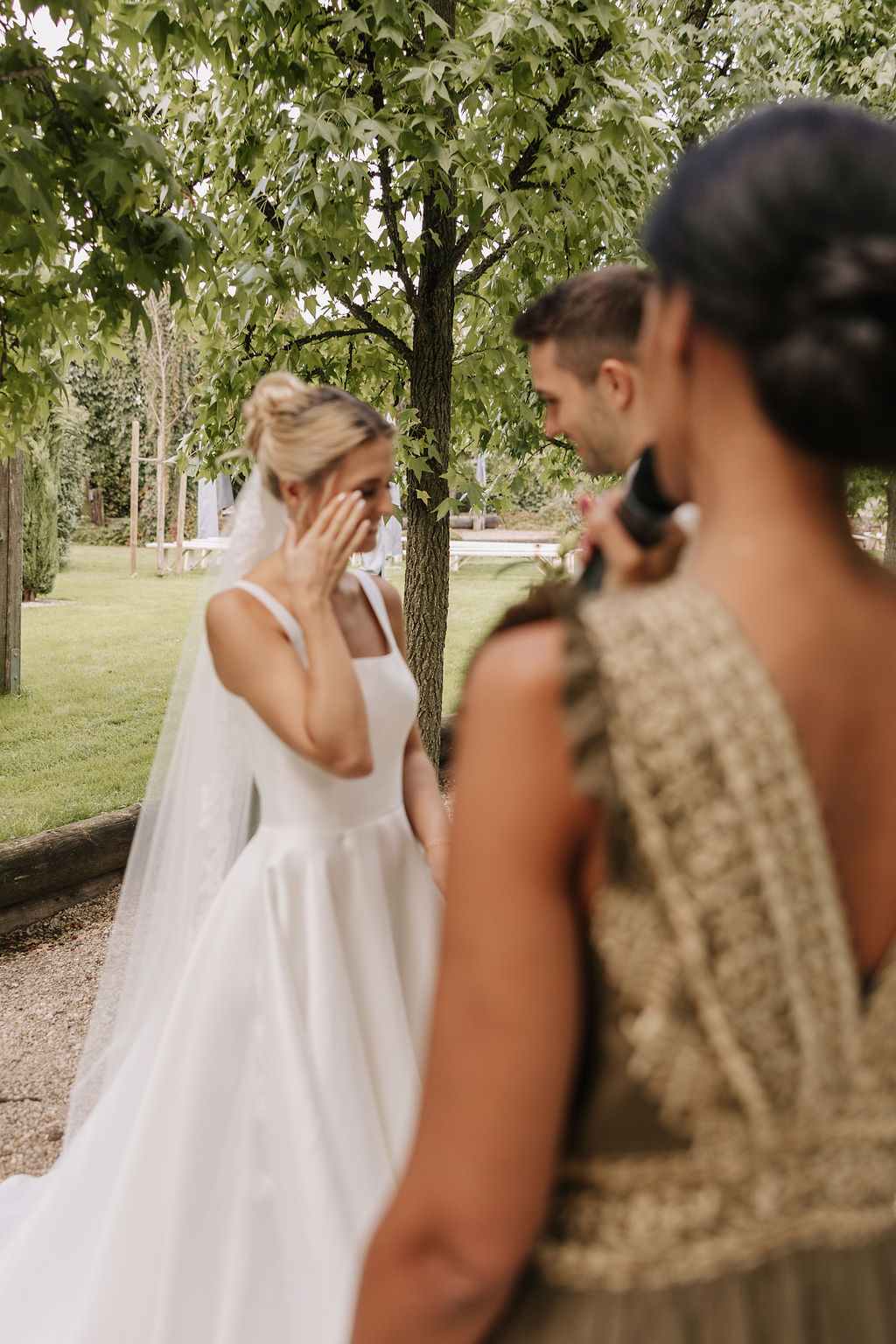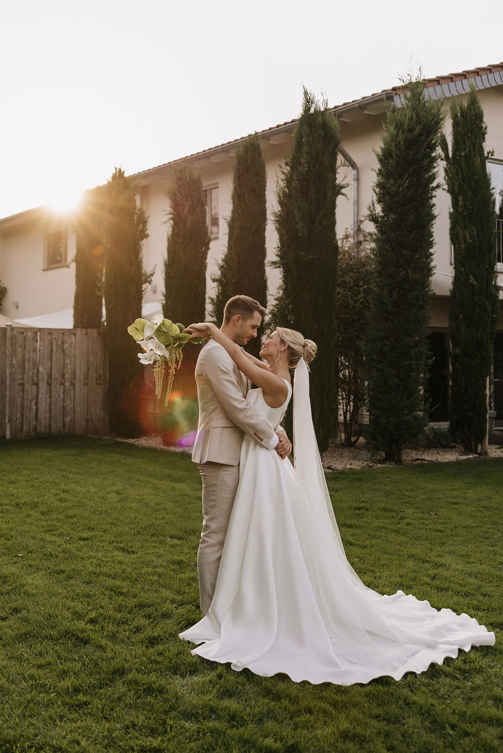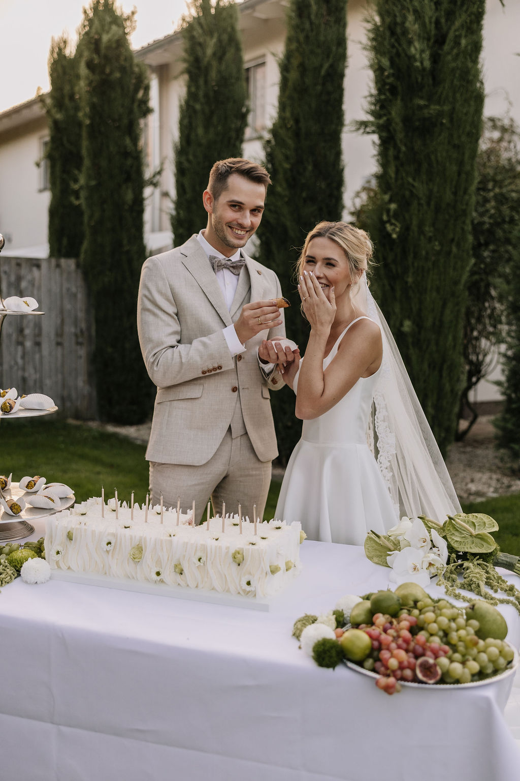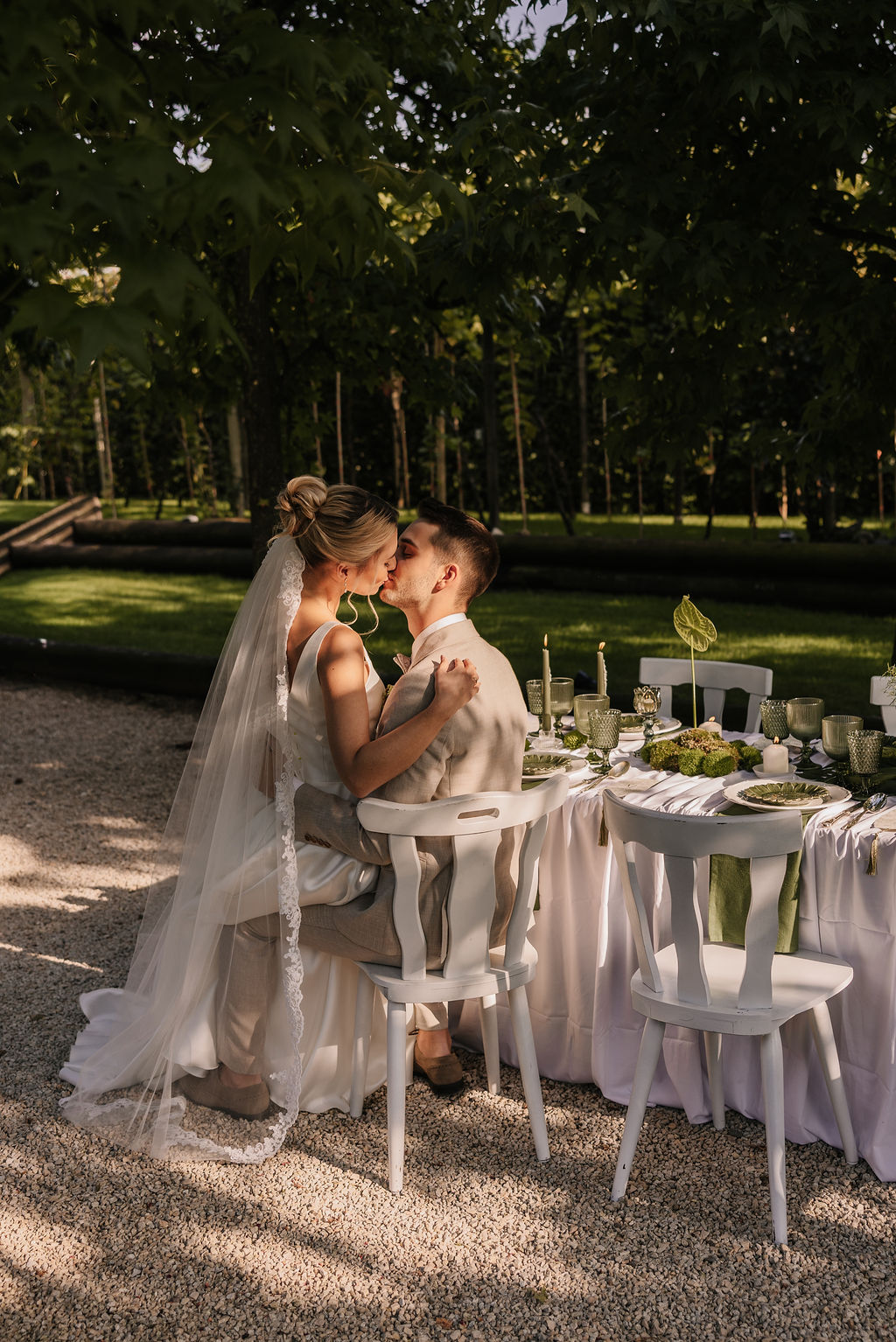 Der Garten wird schnell zum Mittelpunkt der Hochzeit. Hier entstehen Gespräche, Begegnungen und echte Momente. Die Stimmung erinnert mehr an ein italienisches Sommerfest als an eine klassische Hochzeitsfeier. Lange Tafeln, gutes Essen, Wein, Lachen – alles wirkt leicht und ungezwungen.
