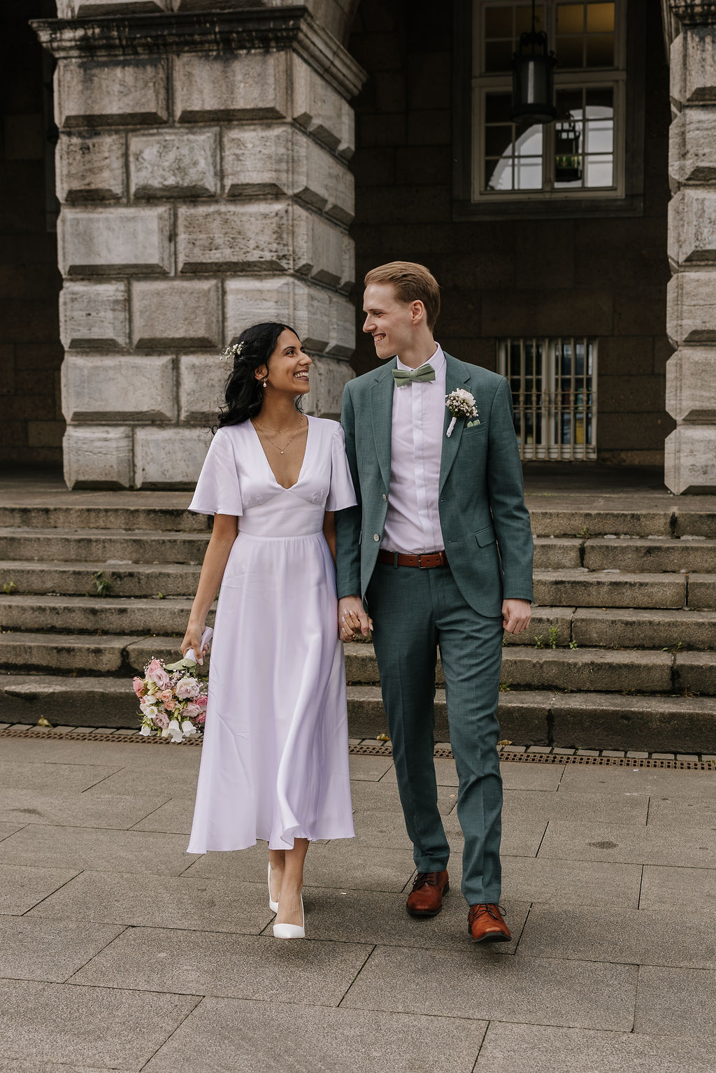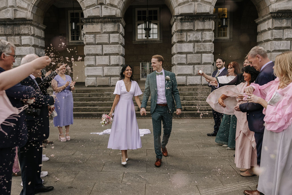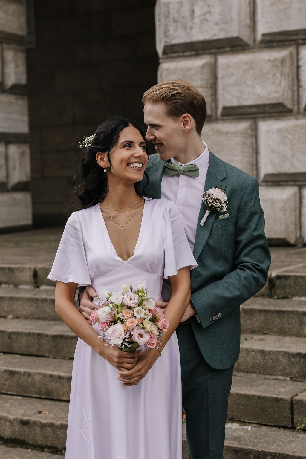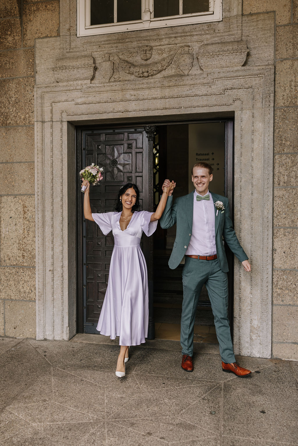 Die standesamtliche Hochzeit von Salina und Jakob fand im Historischen Rathaus Mülheim an der Ruhr statt, zentral gelegen am Rathausplatz. Das historische Gebäude verleiht standesamtlichen Trauungen eine besondere Würde und bietet gleichzeitig eine offene, helle Atmosphäre. Besonders der großzügige Vorplatz macht diesen Ort ideal für Hochzeiten, bei denen Trauung, Sektempfang und erste Begegnungen ganz entspannt ineinander übergehen dürfen.