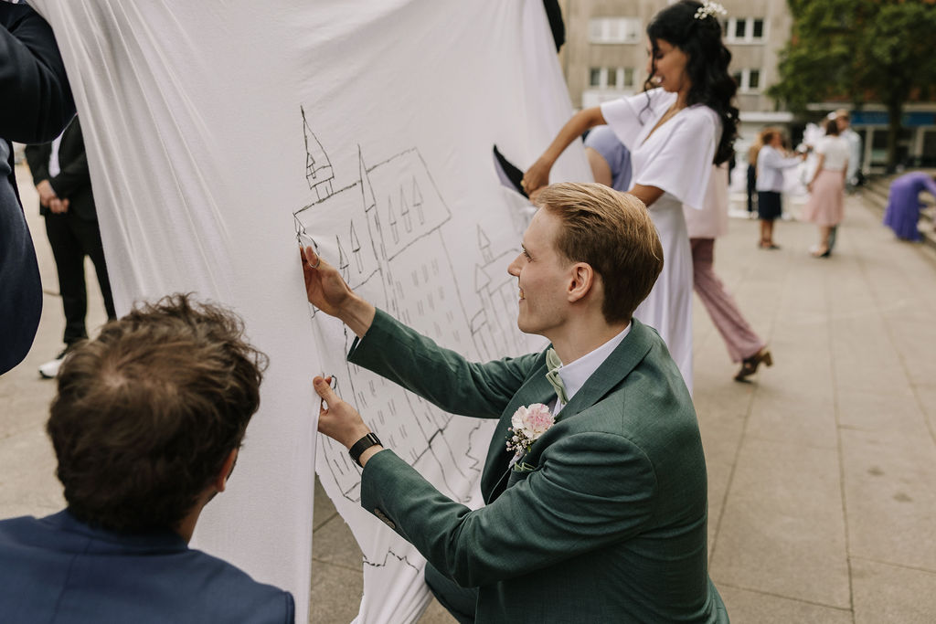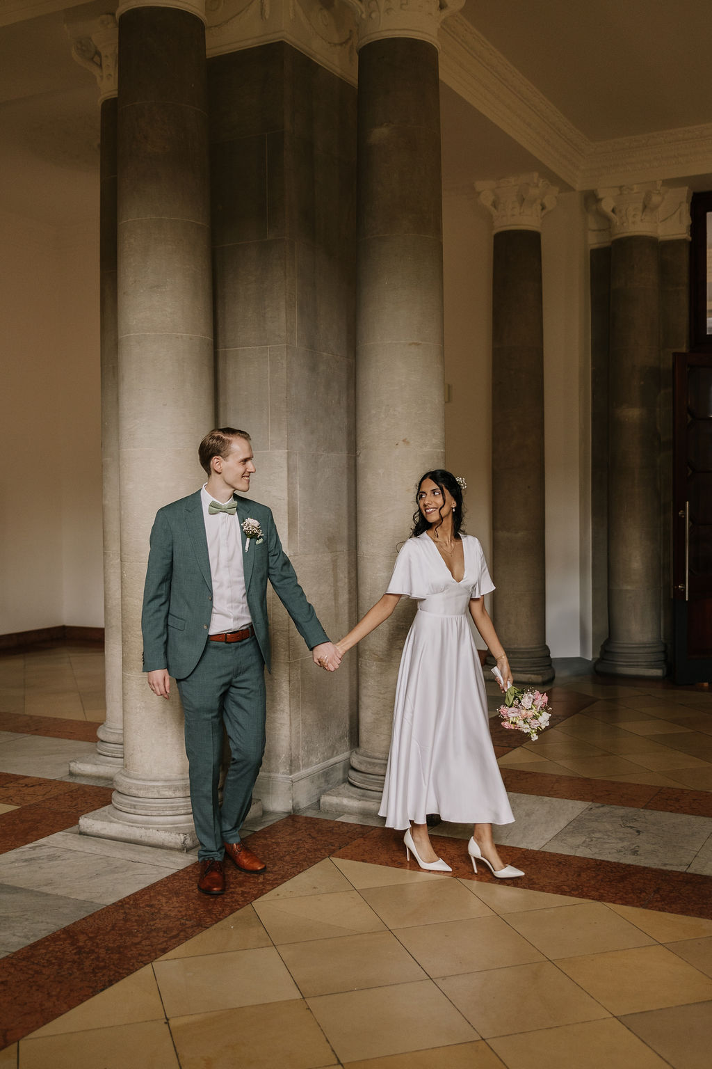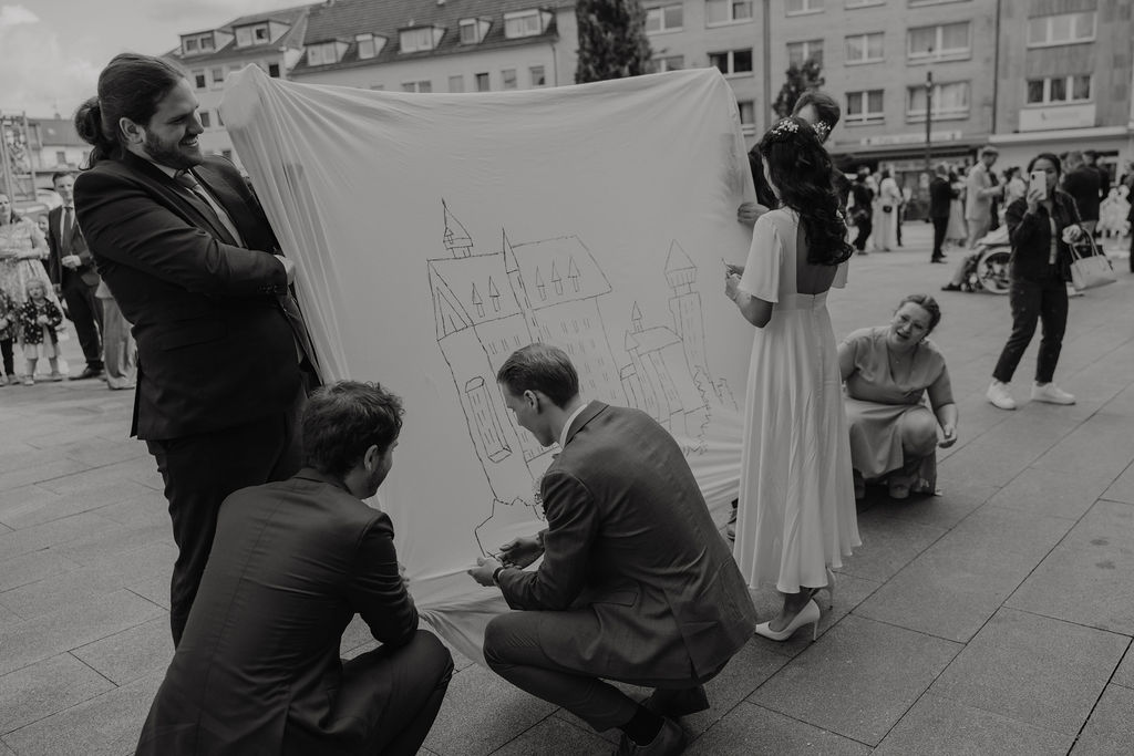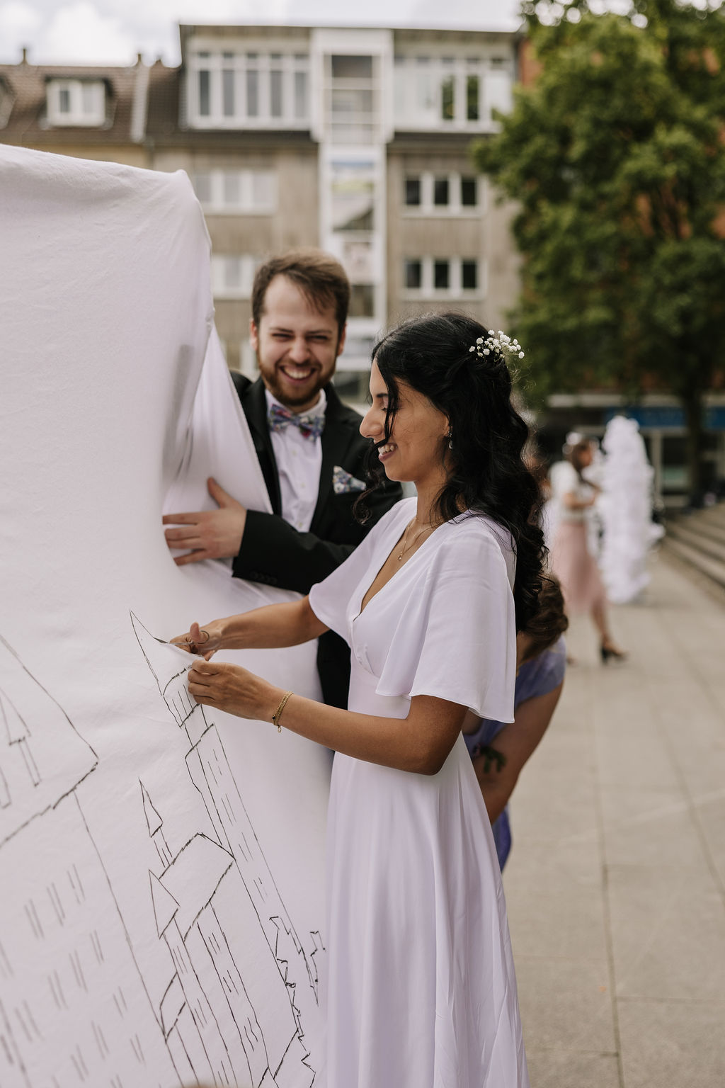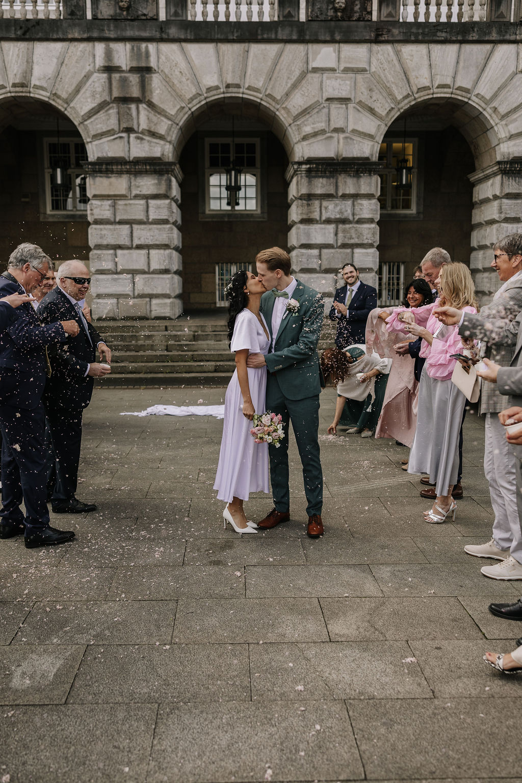 Die standesamtliche Hochzeit von Salina und Jakob fand im Historischen Rathaus Mülheim an der Ruhr statt, zentral gelegen am Rathausplatz. Das historische Gebäude verleiht standesamtlichen Trauungen eine besondere Würde und bietet gleichzeitig eine offene, helle Atmosphäre. Besonders der großzügige Vorplatz macht diesen Ort ideal für Hochzeiten, bei denen Trauung, Sektempfang und erste Begegnungen ganz entspannt ineinander übergehen dürfen.