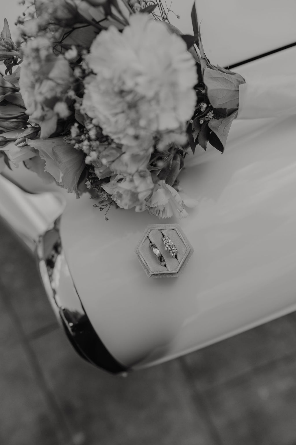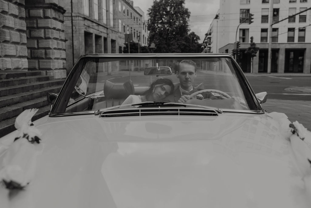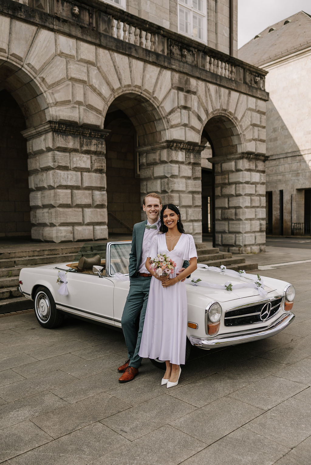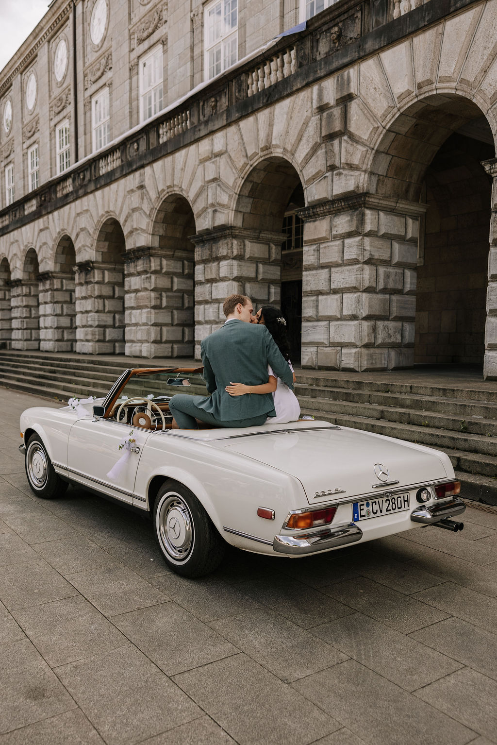 Ein besonderes Highlight der standesamtlichen Hochzeit war das Hochzeitsauto: ein klassischer Mercedes Benz 280 SL. Der Oldtimer fügte sich perfekt in die historische Kulisse des Rathauses ein und verlieh dem Tag eine zeitlose Eleganz. Die Ankunft und Abfahrt im Oldtimer sorgten für besondere Augenblicke – für das Brautpaar ebenso wie für die Gäste.