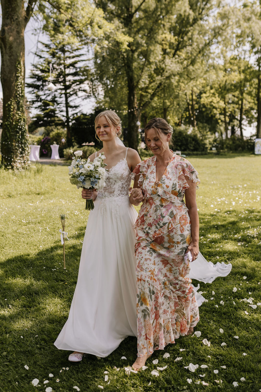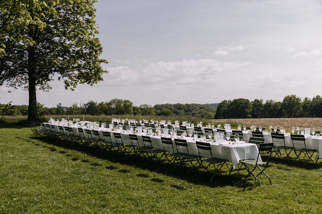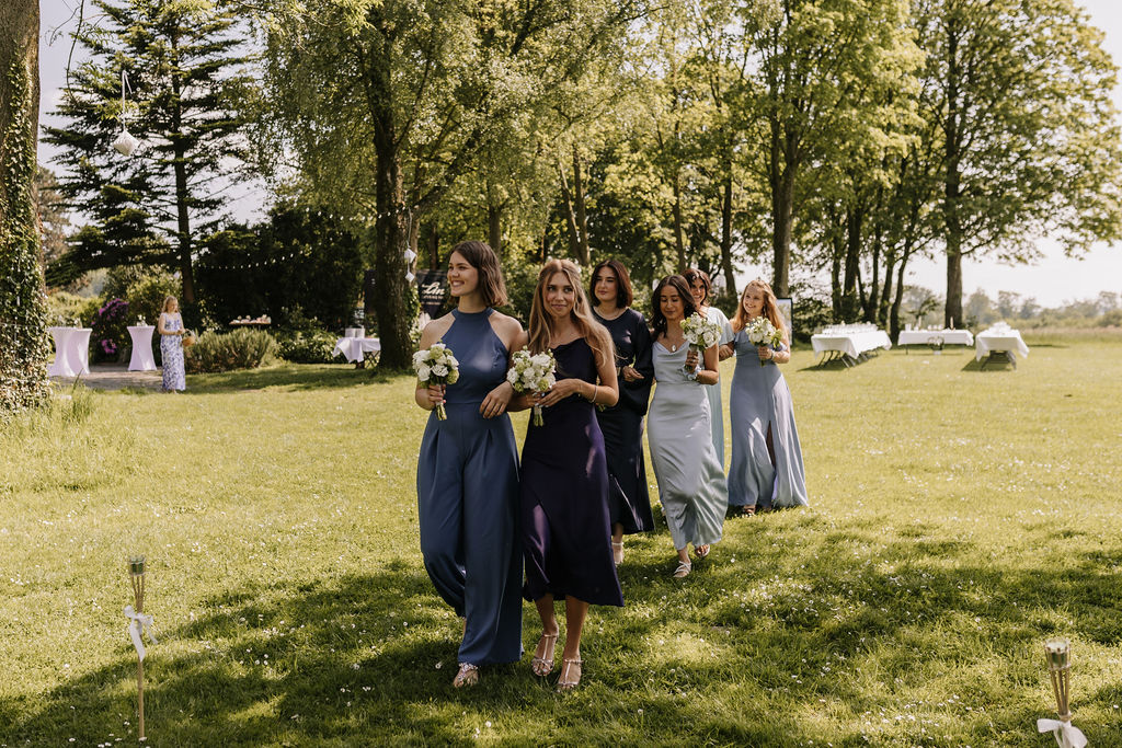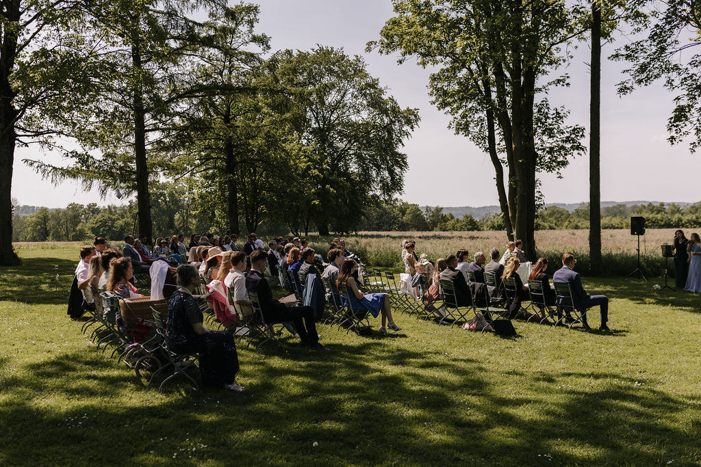 Die beiden wünschten sich eine Hochzeit, die an einen perfekten Sommertag erinnert, und genau das wurde ihnen erfüllt. Die Location, umgeben von Natur und blühenden Wiesen, bot die perfekte Kulisse für ihre Gartenhochzeit. Die Blumenarrangements, liebevoll gestaltet von Die kleine Nelke, ergänzten die natürliche Schönheit des Ortes.