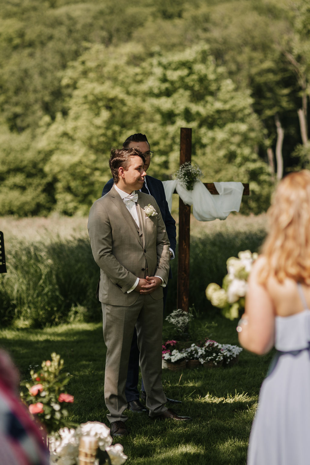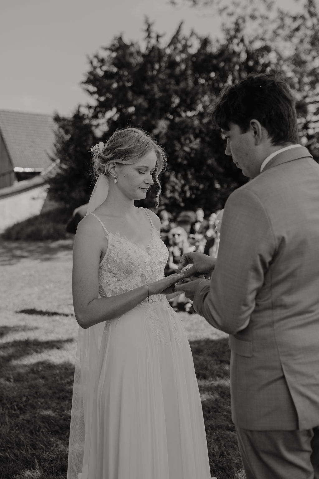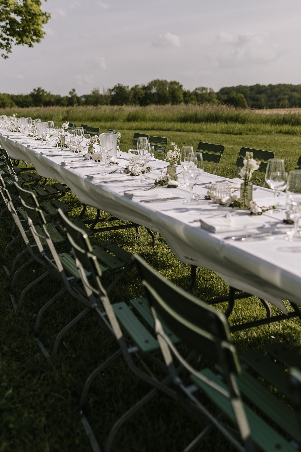Die beiden wünschten sich eine Hochzeit, die an einen perfekten Sommertag erinnert, und genau das wurde ihnen erfüllt. Die Location, umgeben von Natur und blühenden Wiesen, bot die perfekte Kulisse für ihre Gartenhochzeit. Die Blumenarrangements, liebevoll gestaltet von Die kleine Nelke, ergänzten die natürliche Schönheit des Ortes.