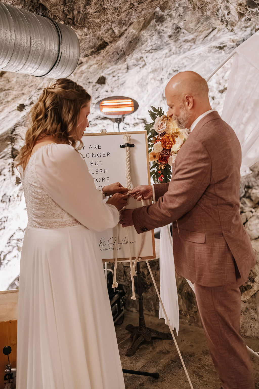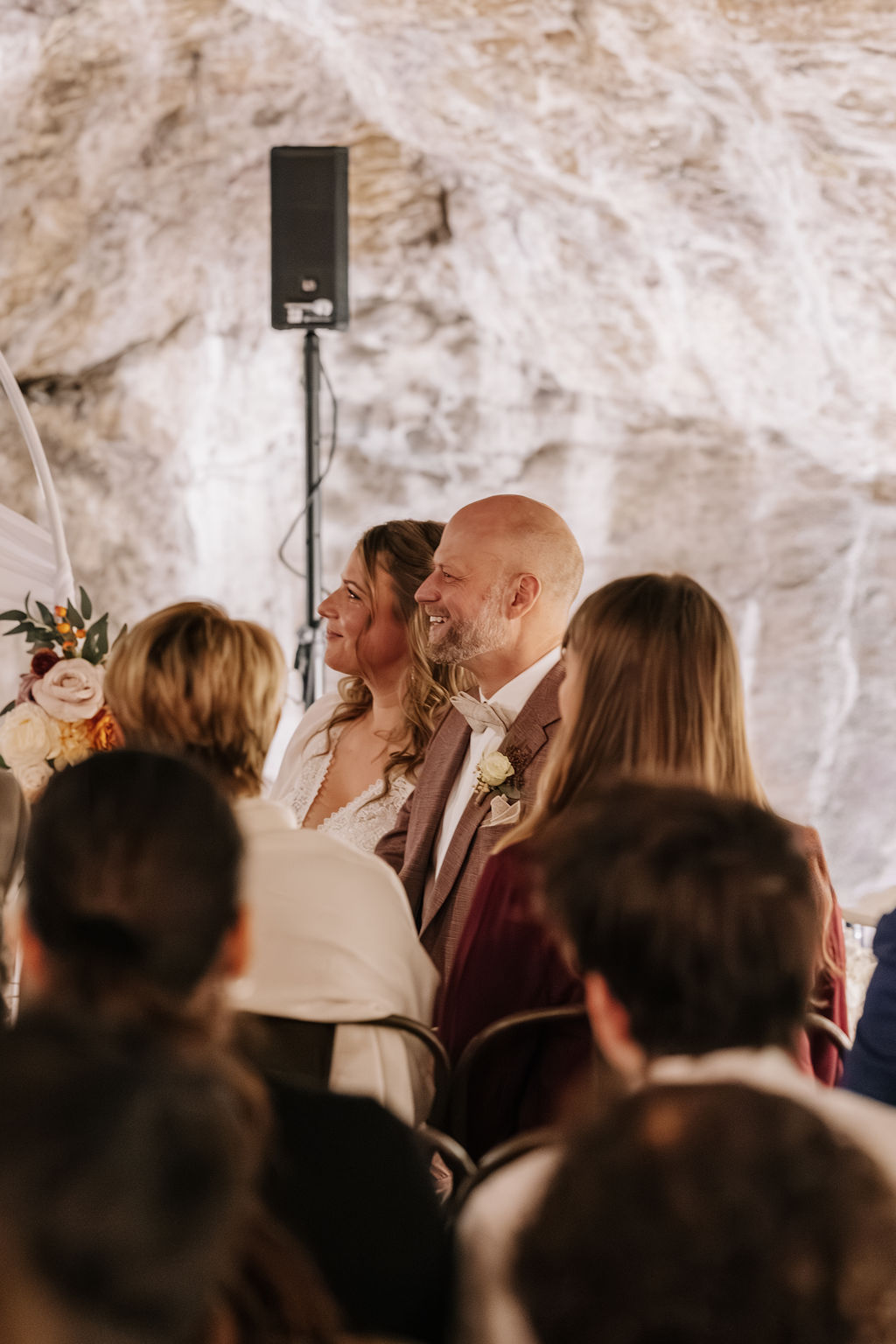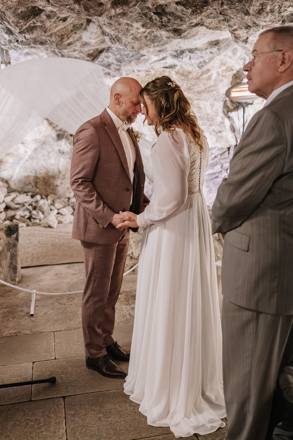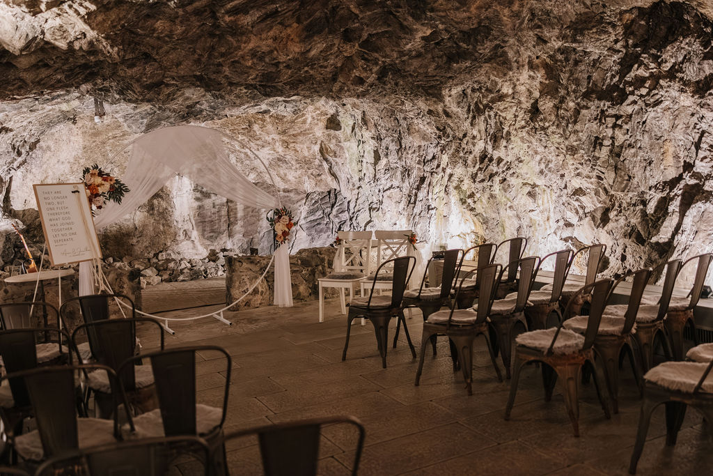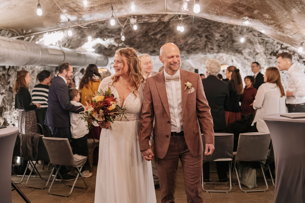 Die Trauung fand tatsächlich in der Höhle der Location statt – eine Kulisse, die man so nur selten erlebt. Die warme Beleuchtung, die natürliche Steinstruktur und die intime Atmosphäre machten diesen Moment unglaublich emotional. Besonders für eine Herbsthochzeit oder Winterhochzeit passt diese Stimmung perfekt: gemütlich, romantisch und gleichzeitig außergewöhnlich.