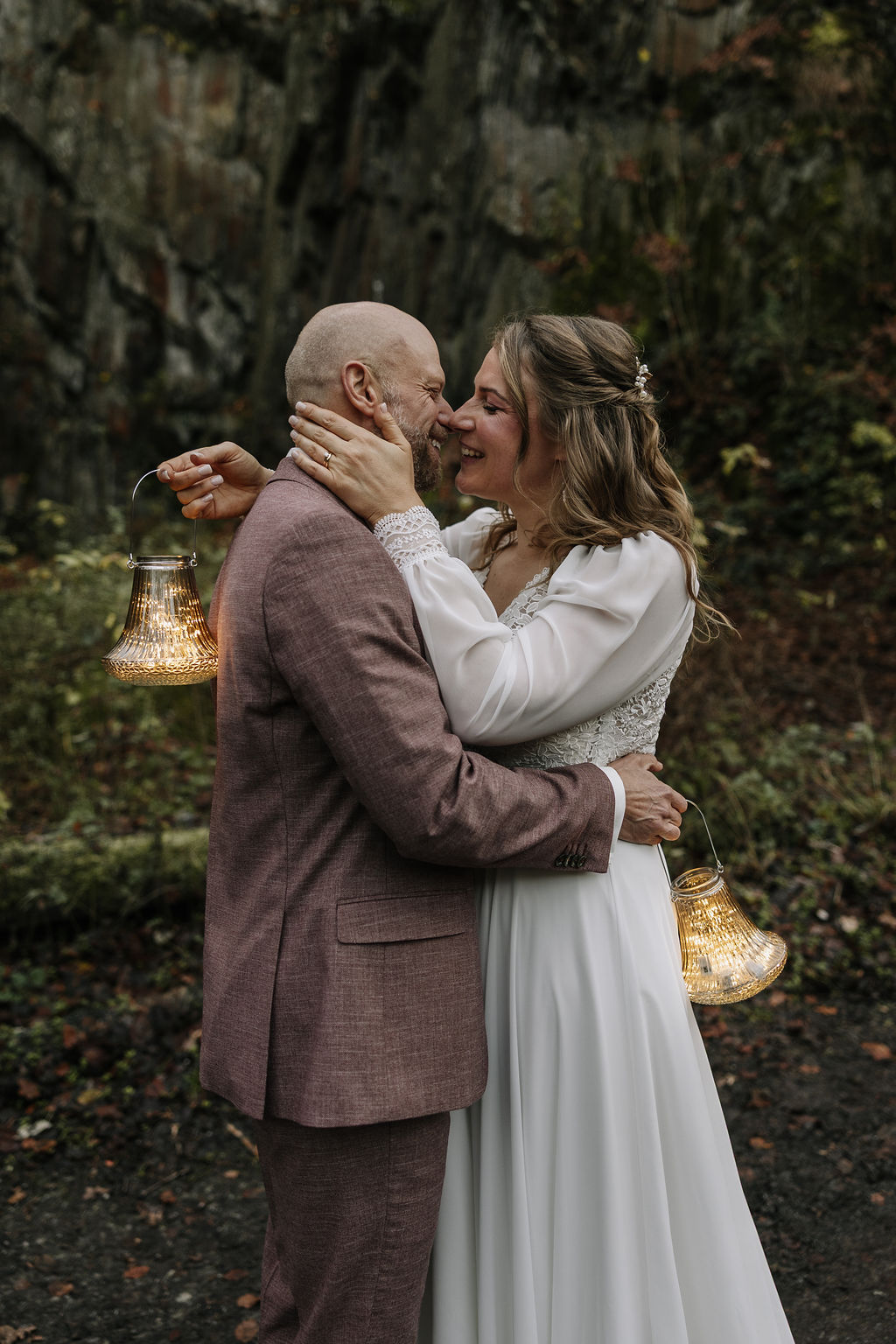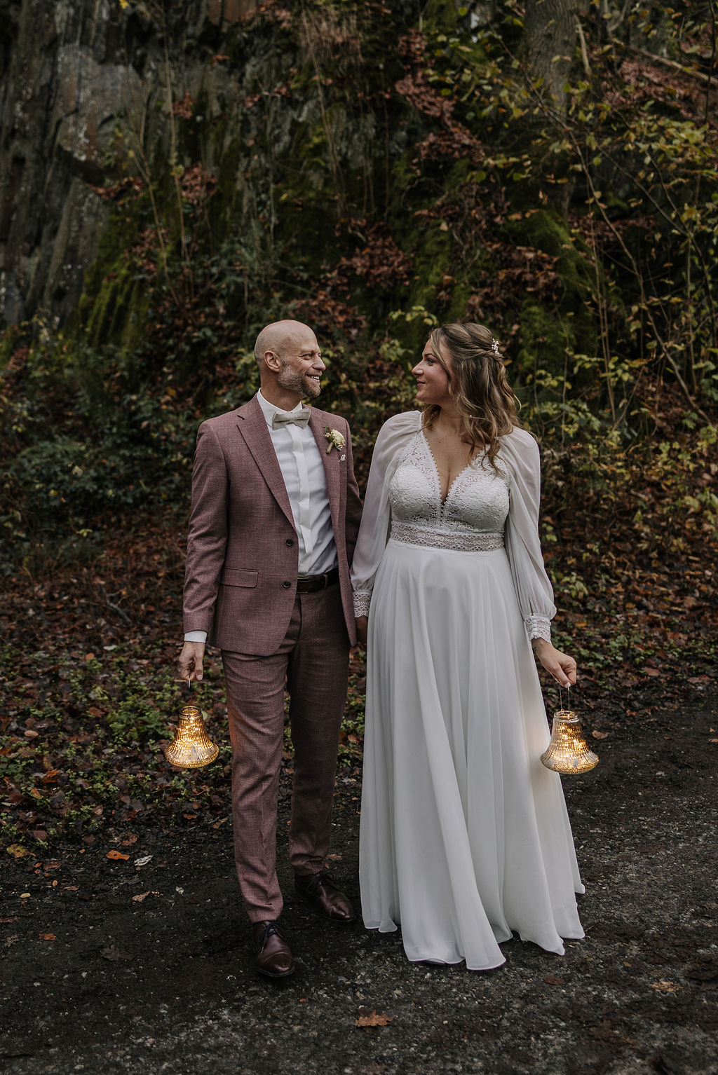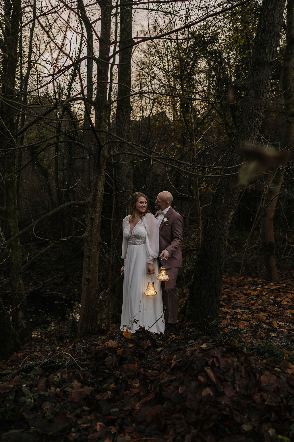 Mit Laternen in den Händen, umgeben von Wald und der herbstlichen Landschaft, entstanden sehr stimmungsvolle Bilder. Gerade für eine Winterhochzeit oder späte Herbsthochzeit passt diese Art von Shooting perfekt und schafft eine fast märchenhafte Atmosphäre.