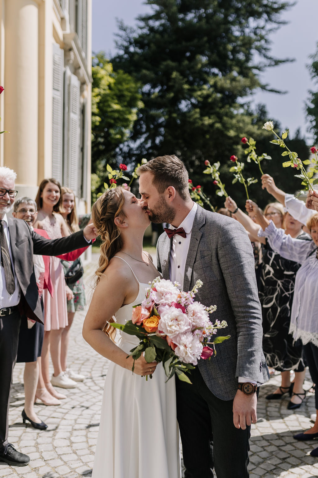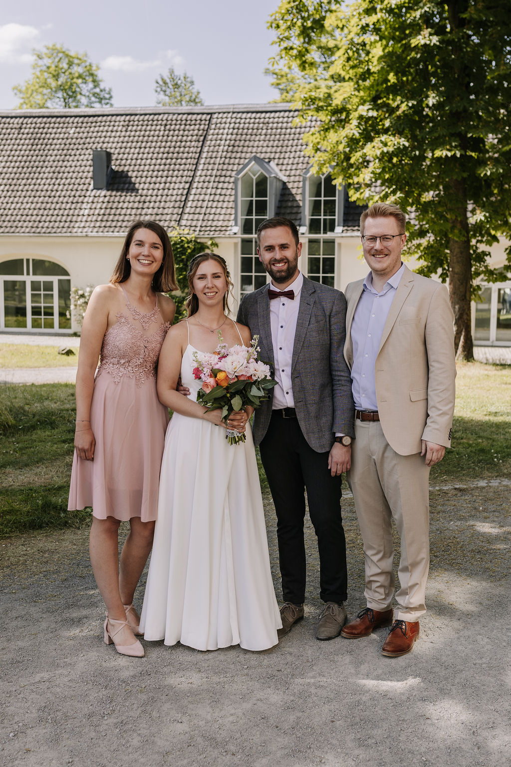 Unter alten Bäumen, mit Blick auf das historische Gebäude, stießen Franzi und Fabian mit ihren Gästen auf ihre Ehe an. Gratulationen, Umarmungen, Gruppenfotos – alles in entspannter Atmosphäre und ohne Ortswechsel.
