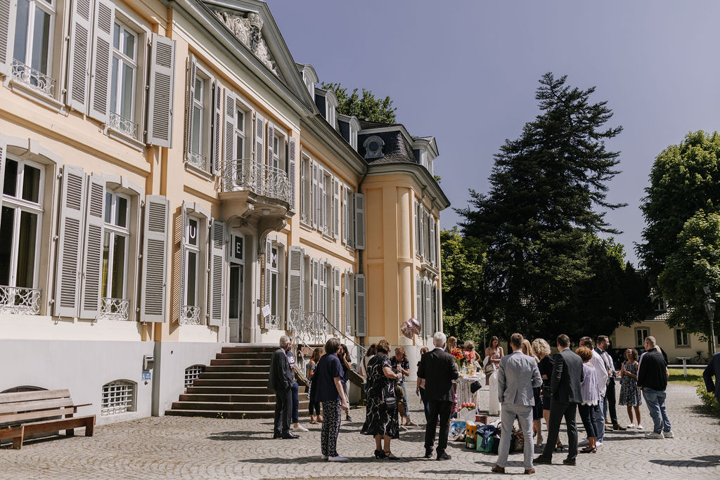 Nach der Zeremonie bietet das Außengelände rund um Schloss Morsbroich eine wunderschöne Möglichkeit für einen Sektempfang im Grünen. Genau das macht diese Location so besonders: Man tritt aus dem Trausaal direkt in die parkähnliche Umgebung.