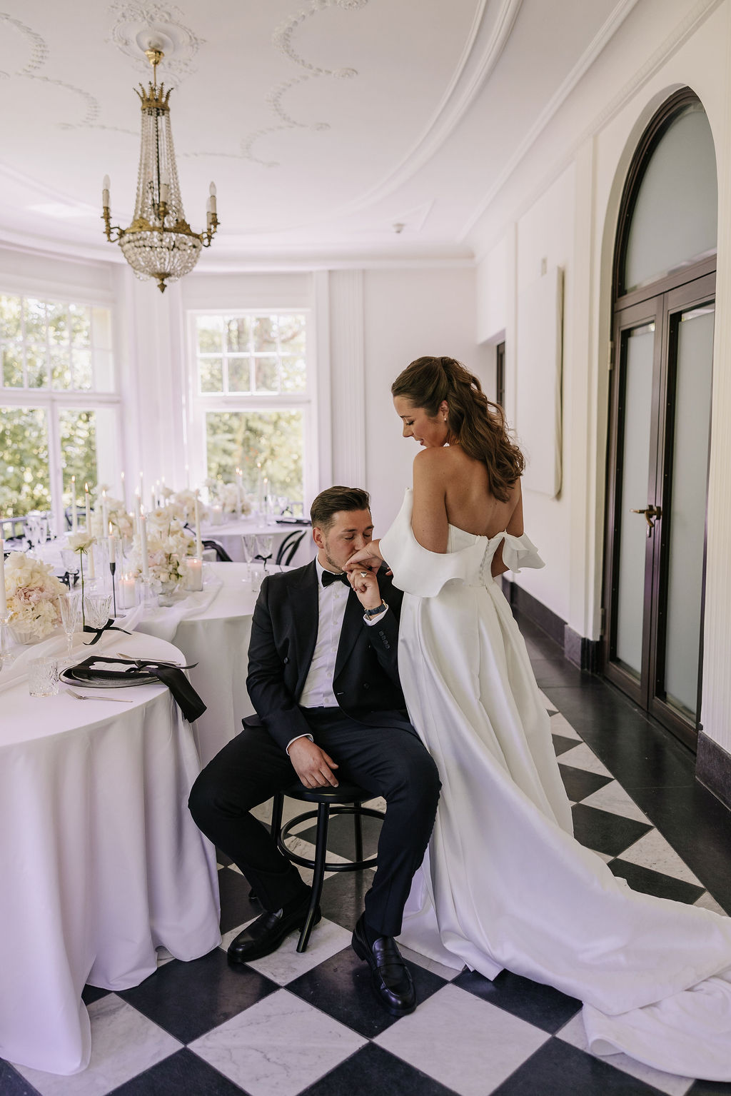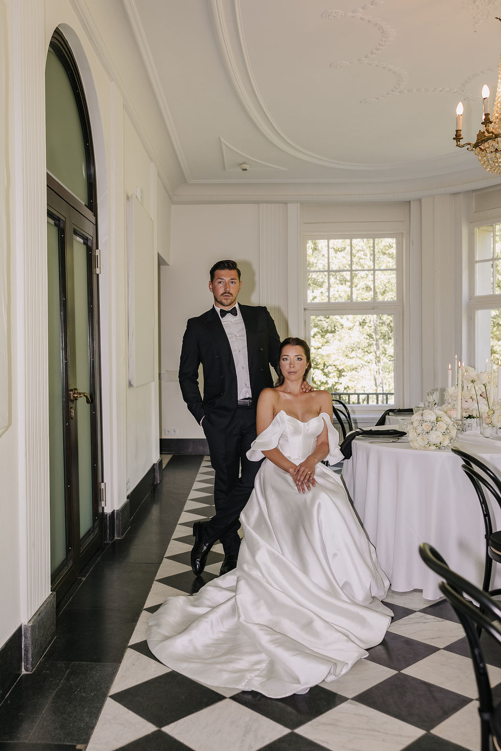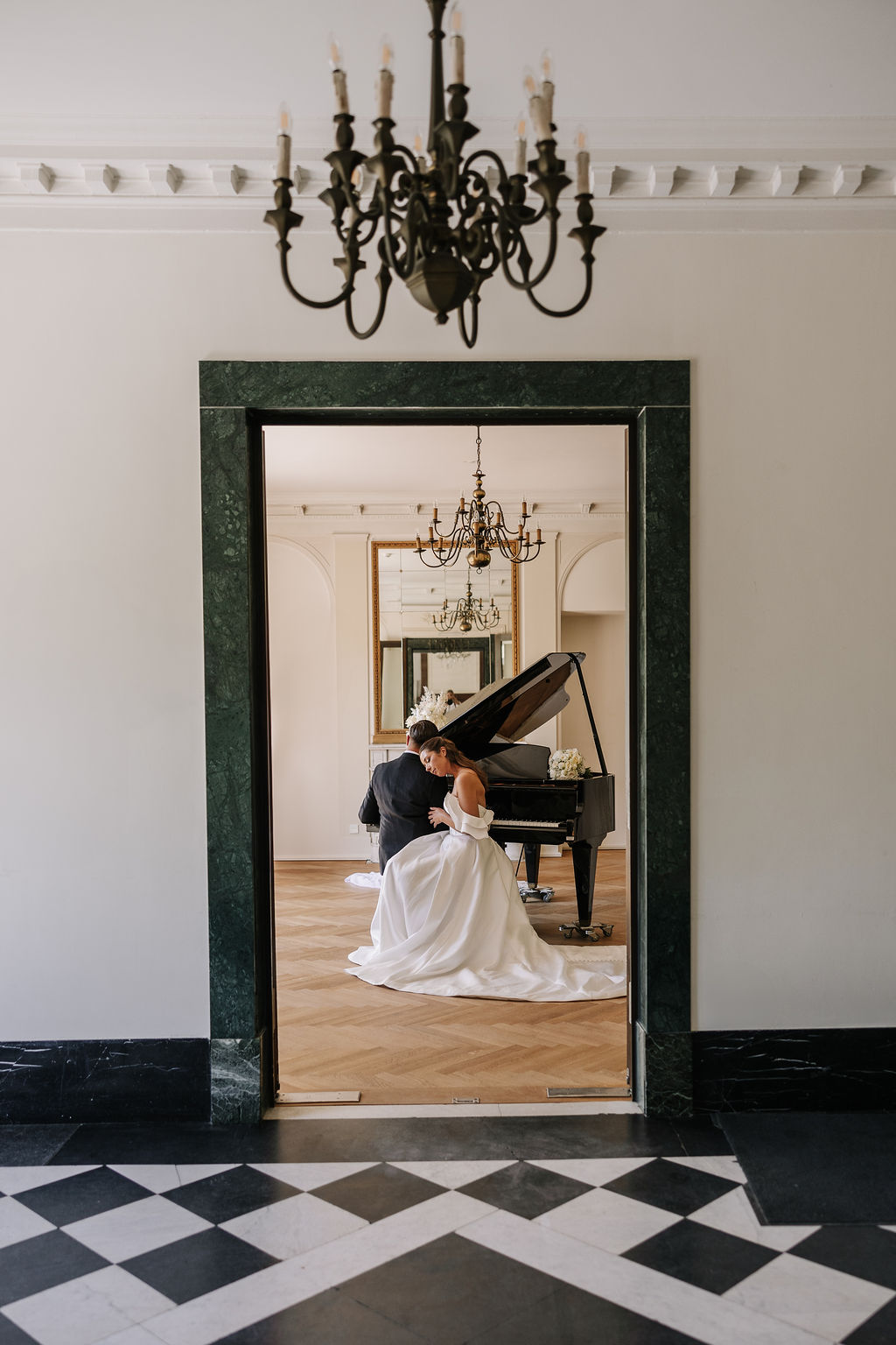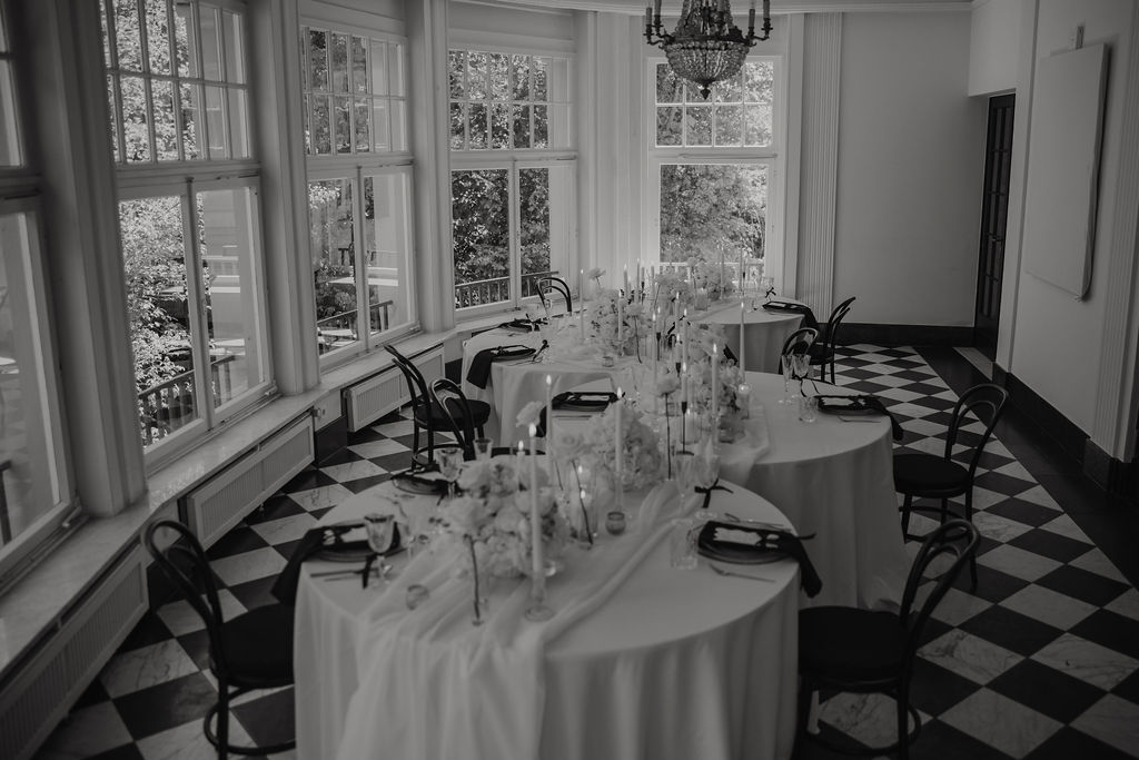 Auch die Innenräume des Schlosses sind vielseitig und hochwertig. Besonders hervorzuheben ist der Raum mit dem markanten Schachbrettmuster aus Fliesen, der durch seine klare Geometrie und Eleganz sofort ins Auge fällt. Er zählt zu den charakteristischsten Räumen der Location und bietet eine außergewöhnliche Bühne für Trauungen oder Empfänge.