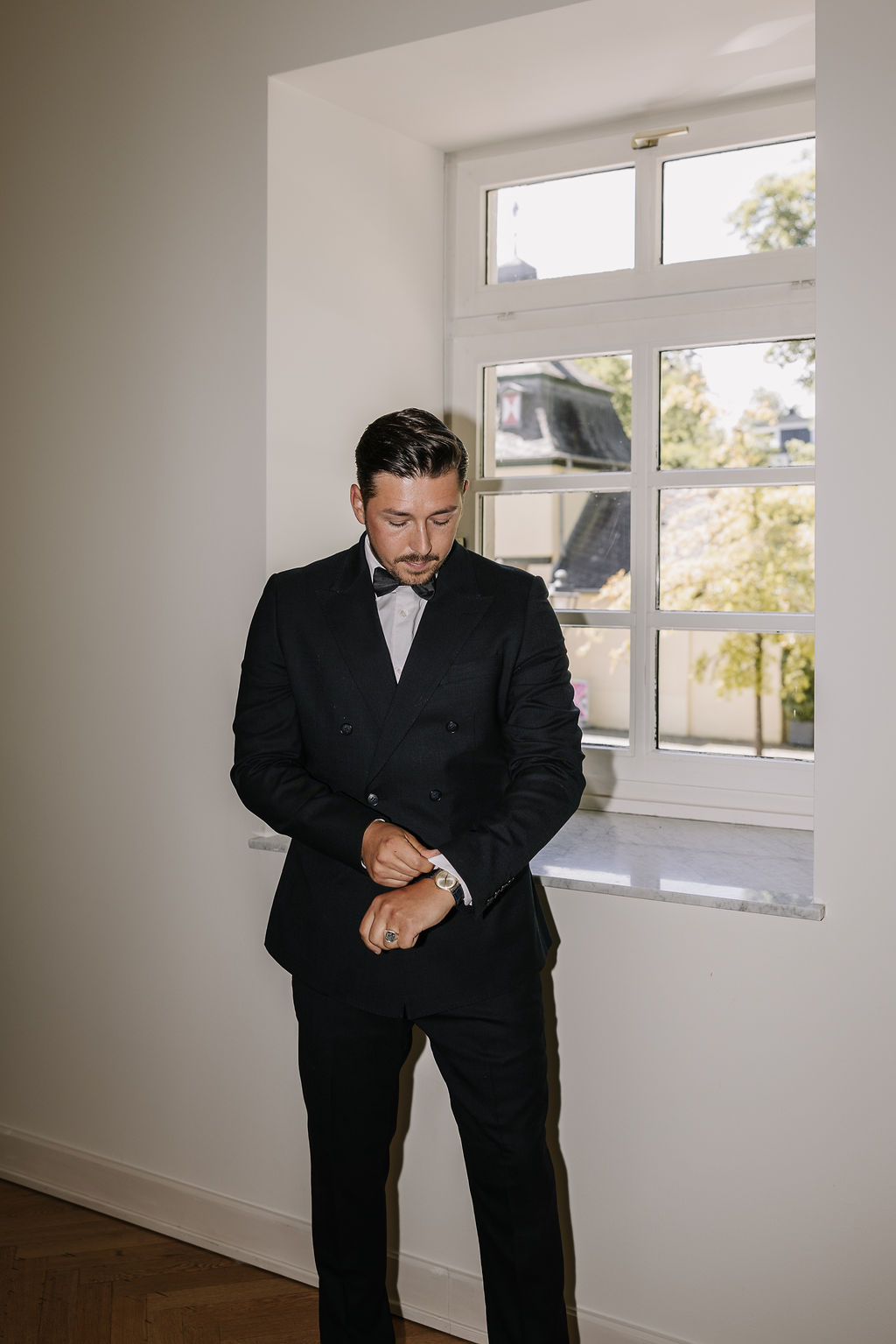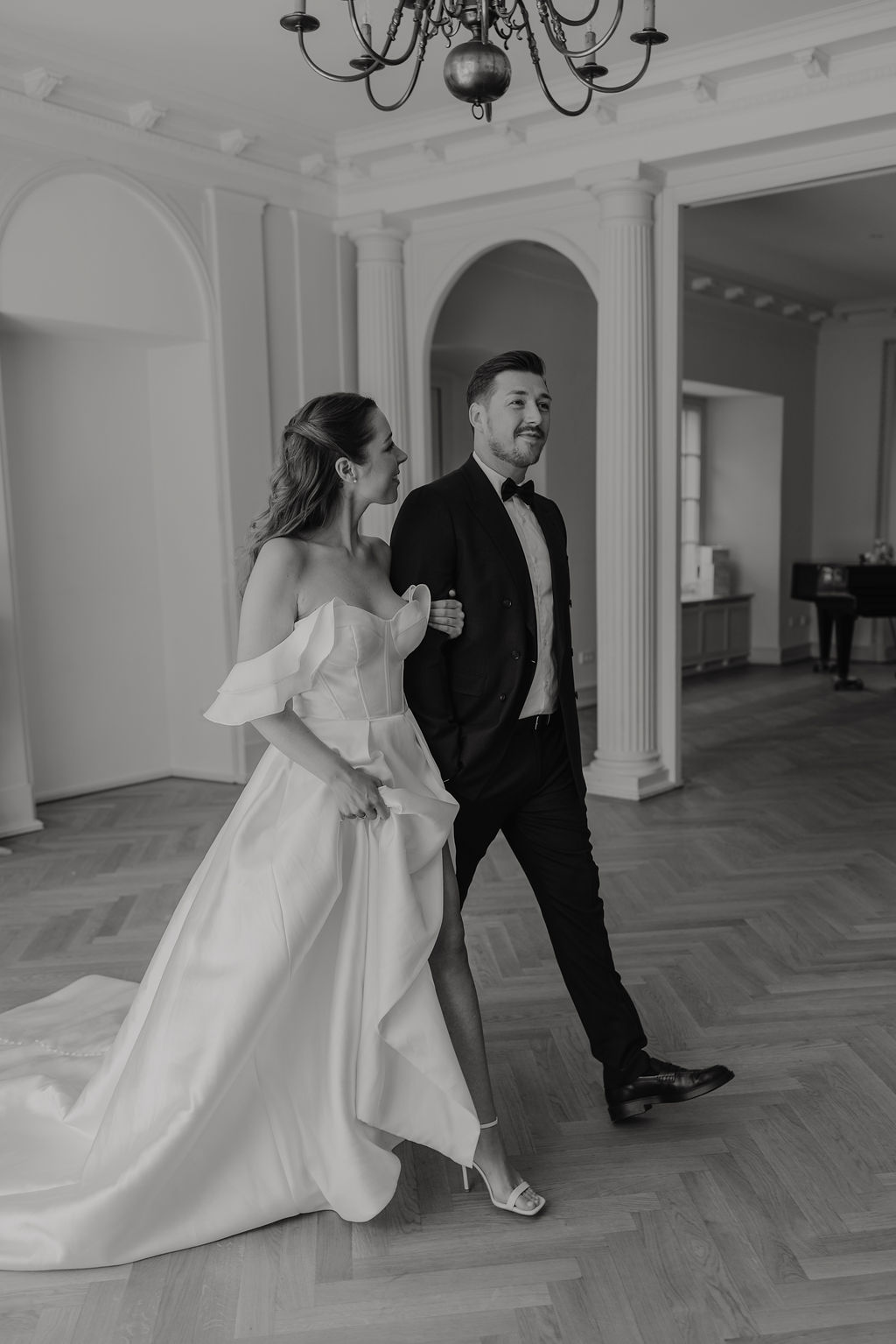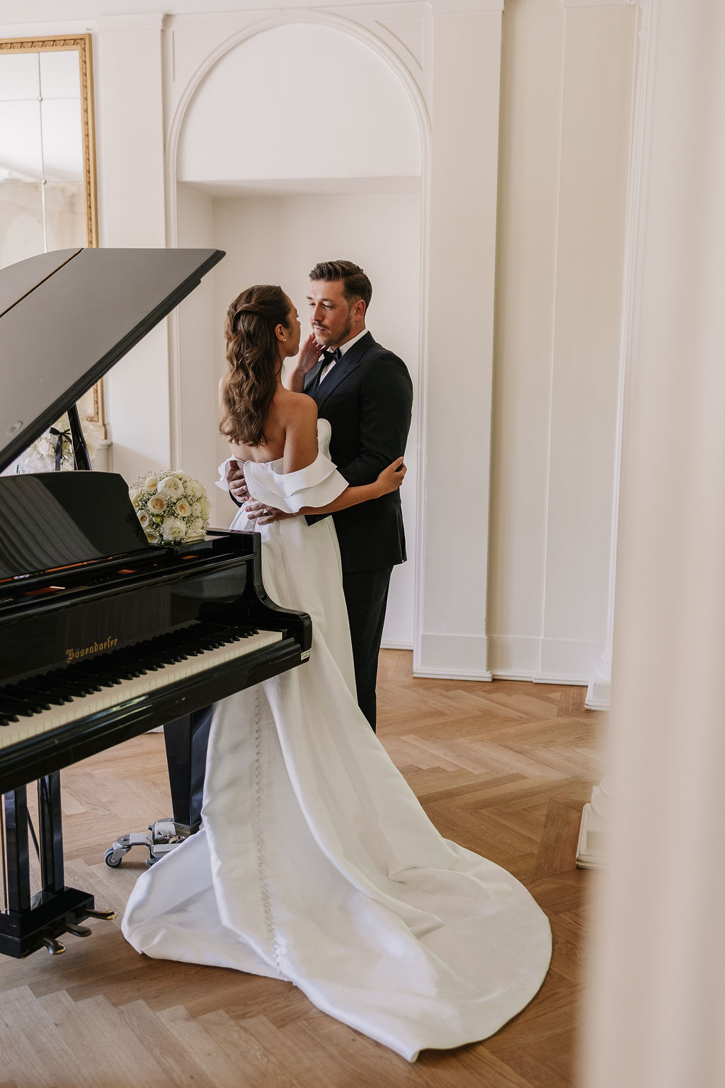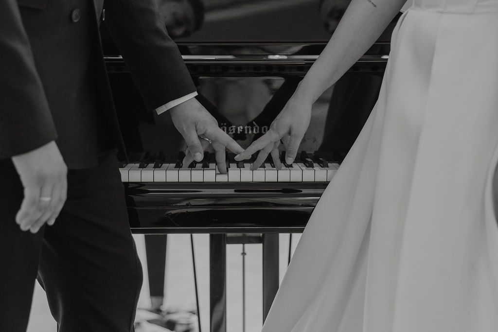 Ein weiteres Highlight ist der Bergische Saal. Hohe Decken, Säulen, ein wunderschöner Kamin und ein eleganter Flügel prägen den Raum. Das Fischgrätenparkett verleiht ihm zusätzliche Tiefe und Wärme, während das Zusammenspiel aus historischen Elementen und klarer Struktur eine besonders edle Wirkung entfaltet. Der Bergische Saal eignet sich ideal für standesamtliche Trauungen, Dinner oder eine stilvolle Feier im Inneren.