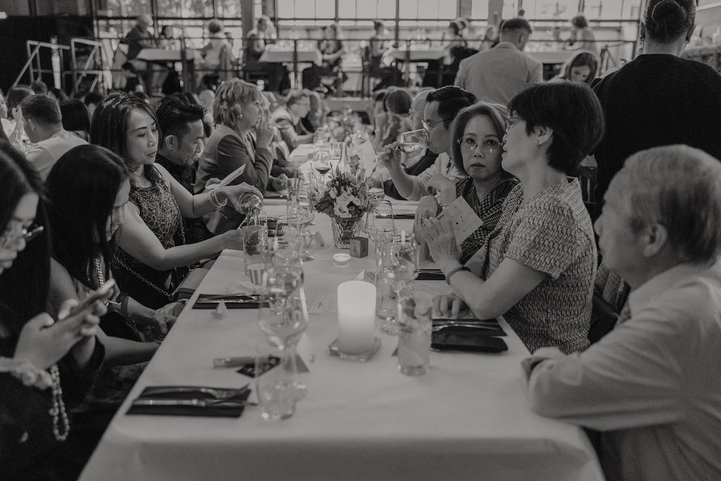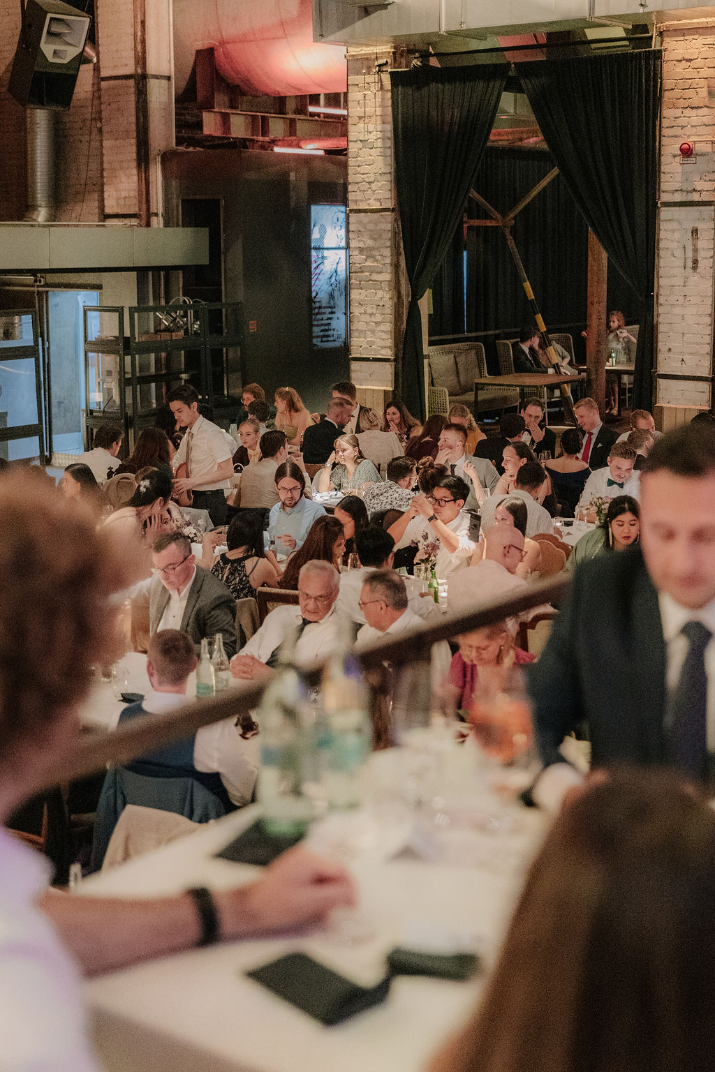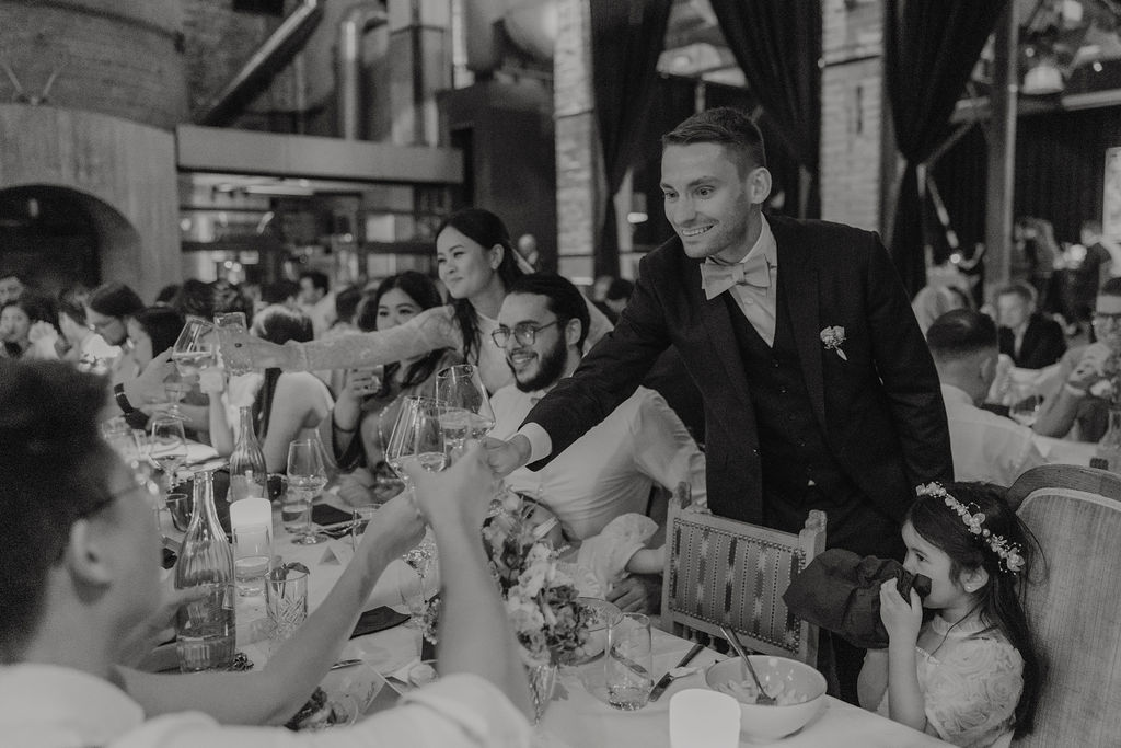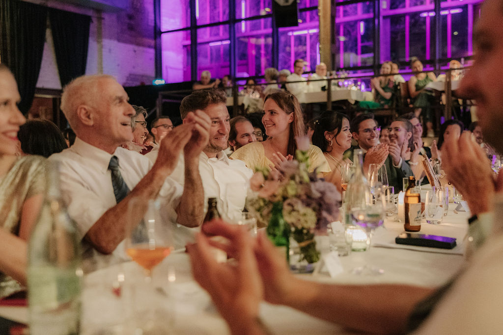 Auch die Hochzeitsfeier fand in der Seifenfabrik Düsseldorf statt. Beim Sektempfang begrüßte das Paar seine Gäste persönlich, bevor der Abend mit einem liebevoll vorbereiteten Dinner begann. Reden, gemeinsames Essen und ein entspannter Ausklang führten schließlich in eine ausgelassene Feier.