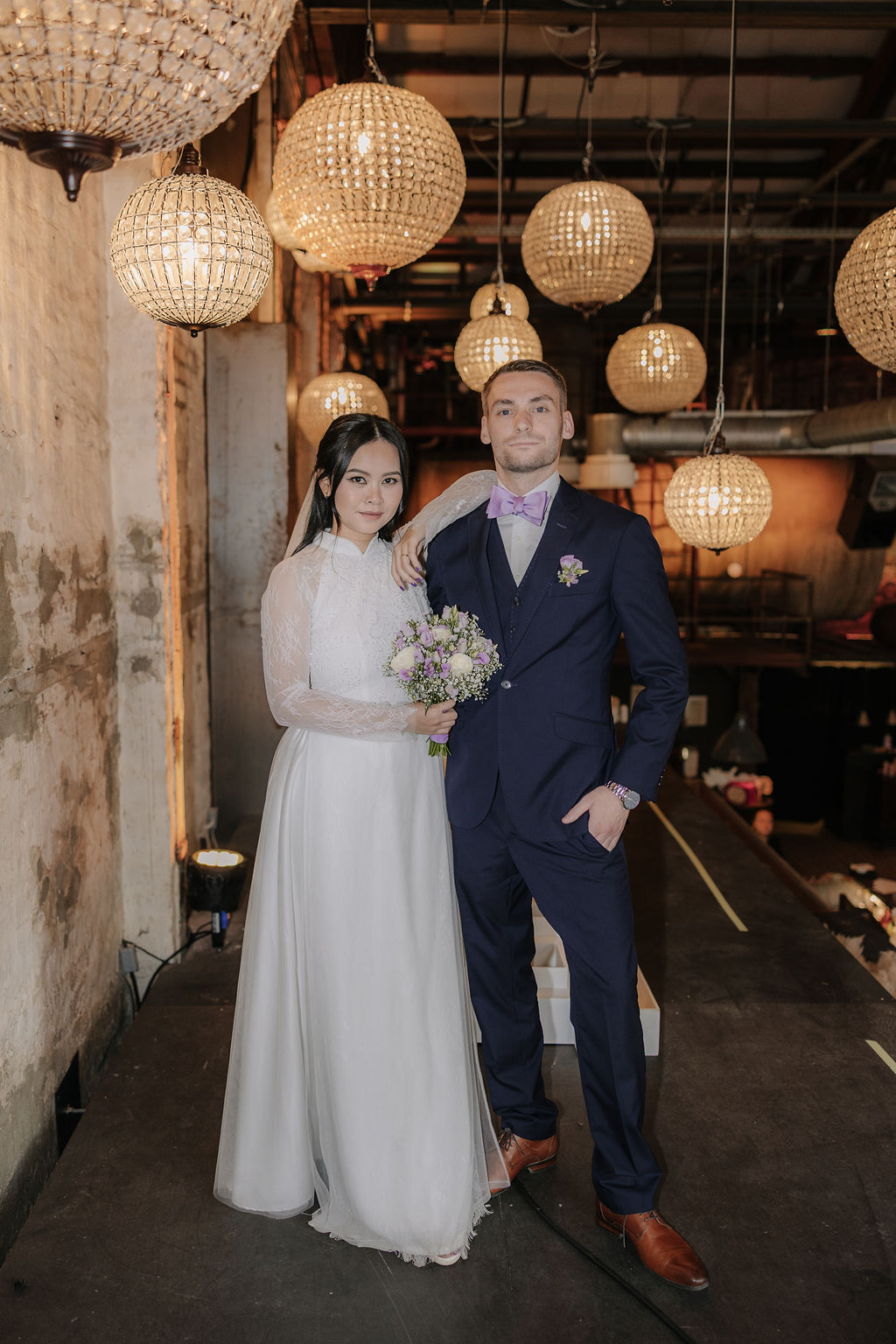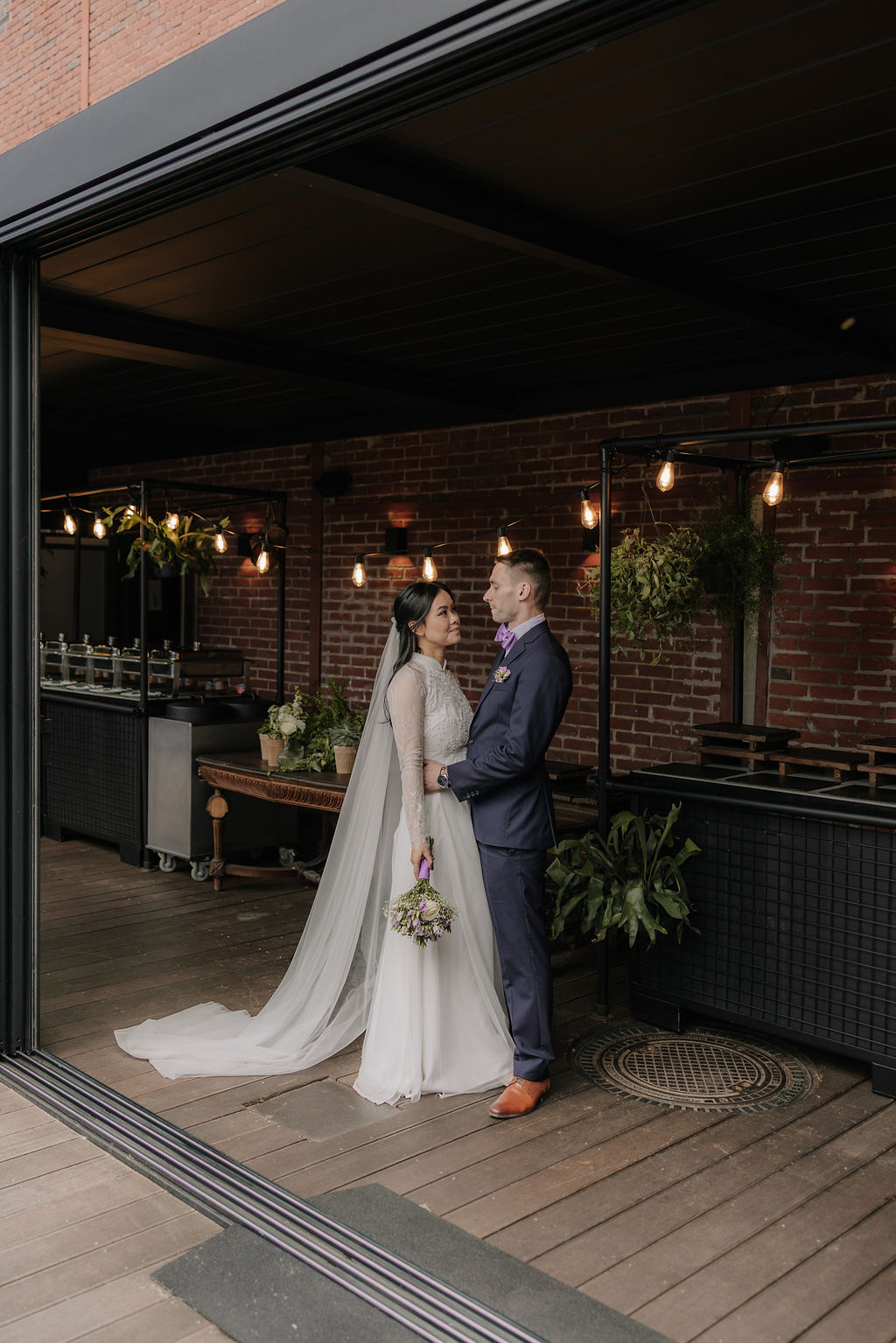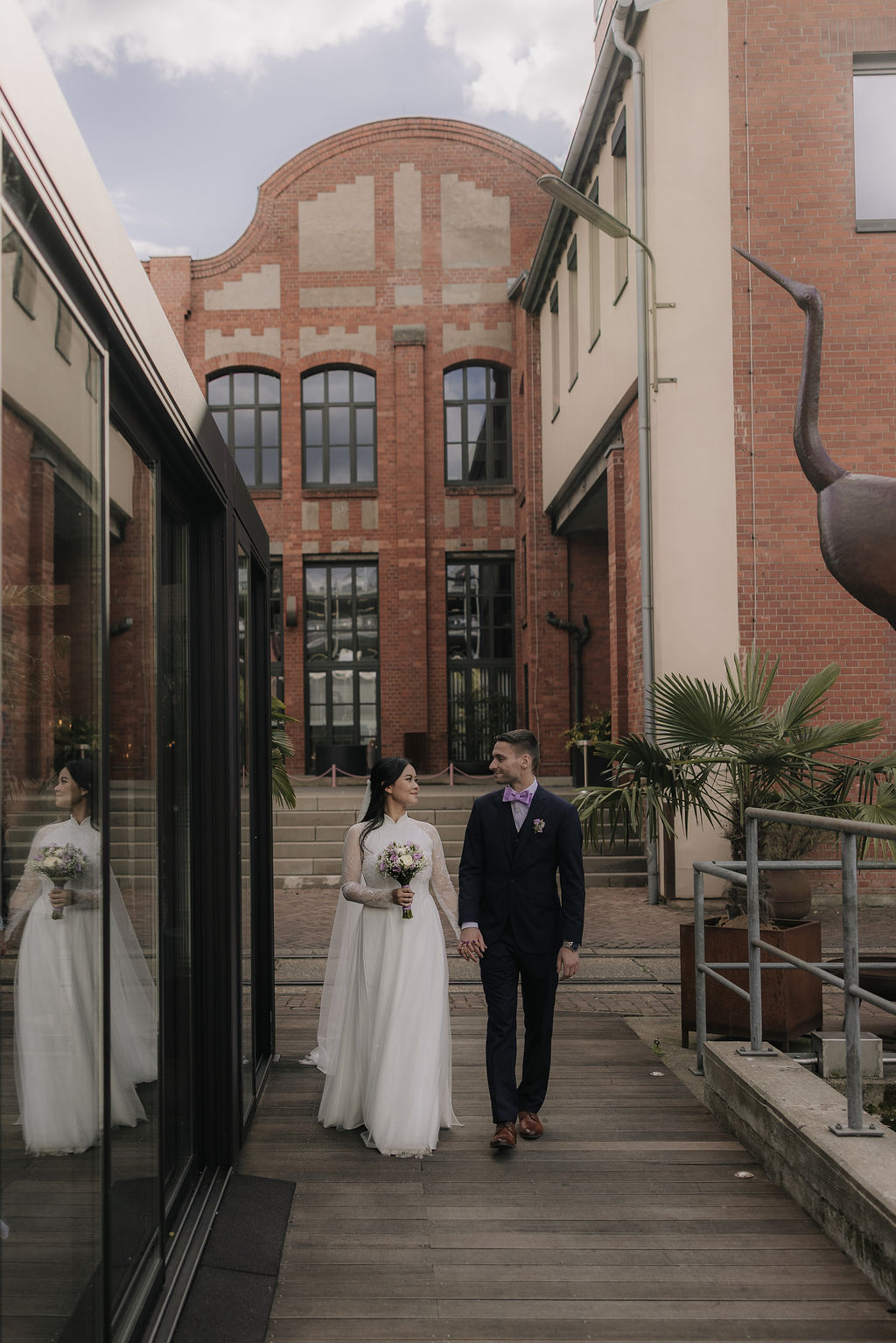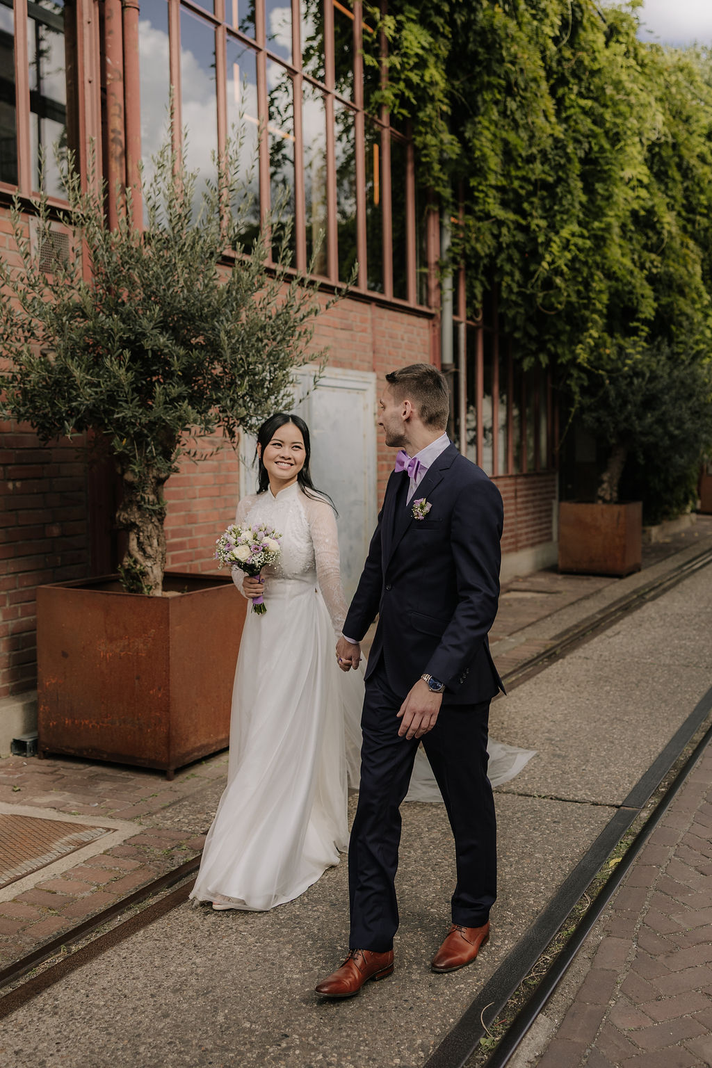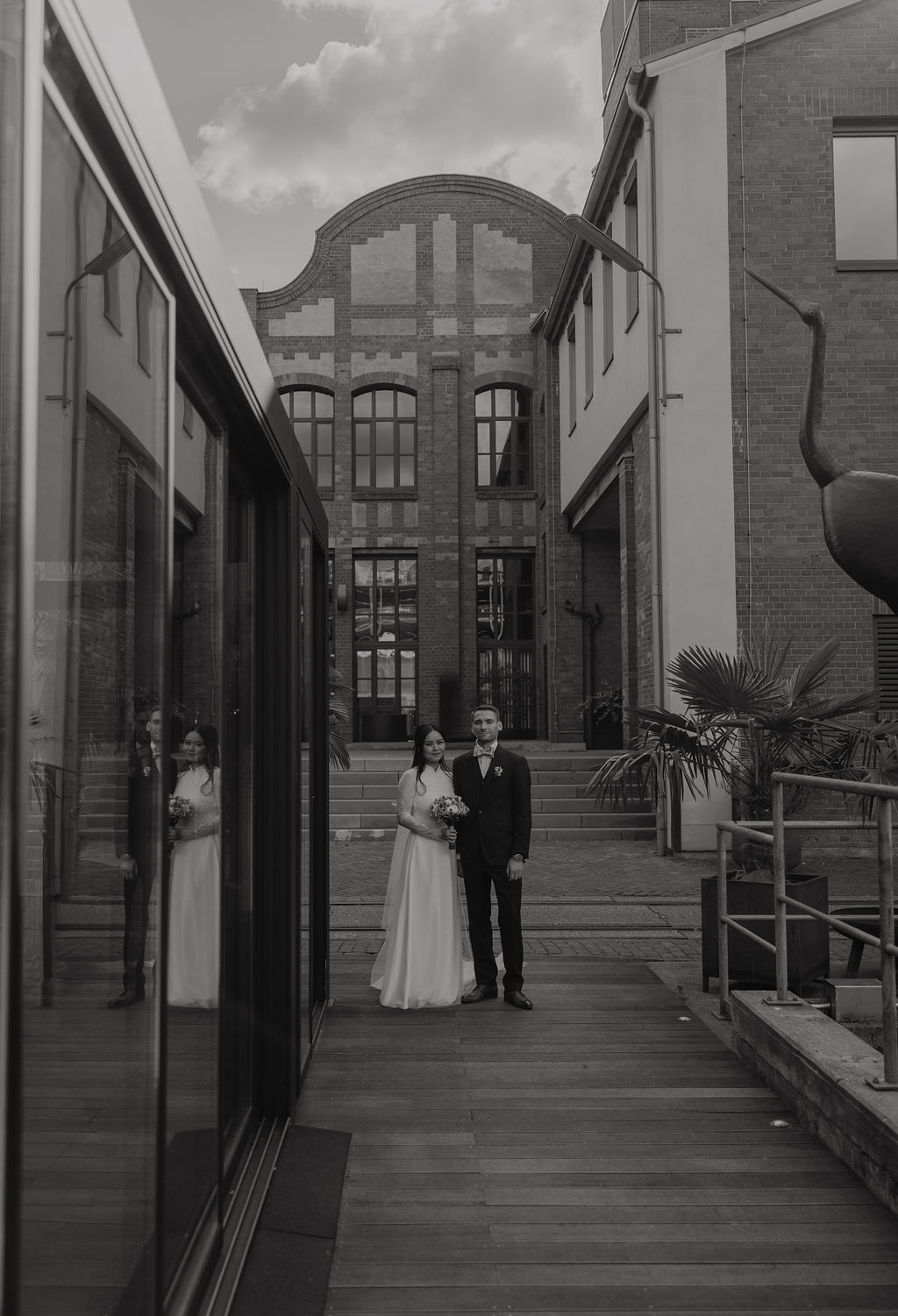 Für das Brautpaarshooting ging es anschließend in die Seifenfabrik Düsseldorf. Die industrielle Architektur, das besondere Licht und die offenen Flächen bieten eine starke Kulisse für moderne, zeitlose Hochzeitsfotos. In dieser Umgebung nahmen sich Xuni und Marius bewusst Zeit nur für sich. Ruhig, konzentriert und ganz bei sich entstanden natürliche Bilder, die Nähe und Verbundenheit zeigen.