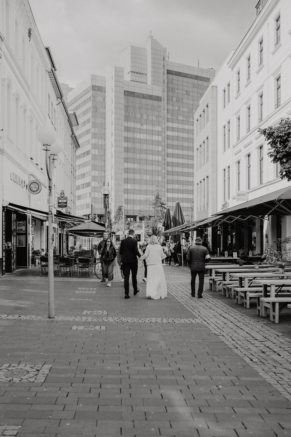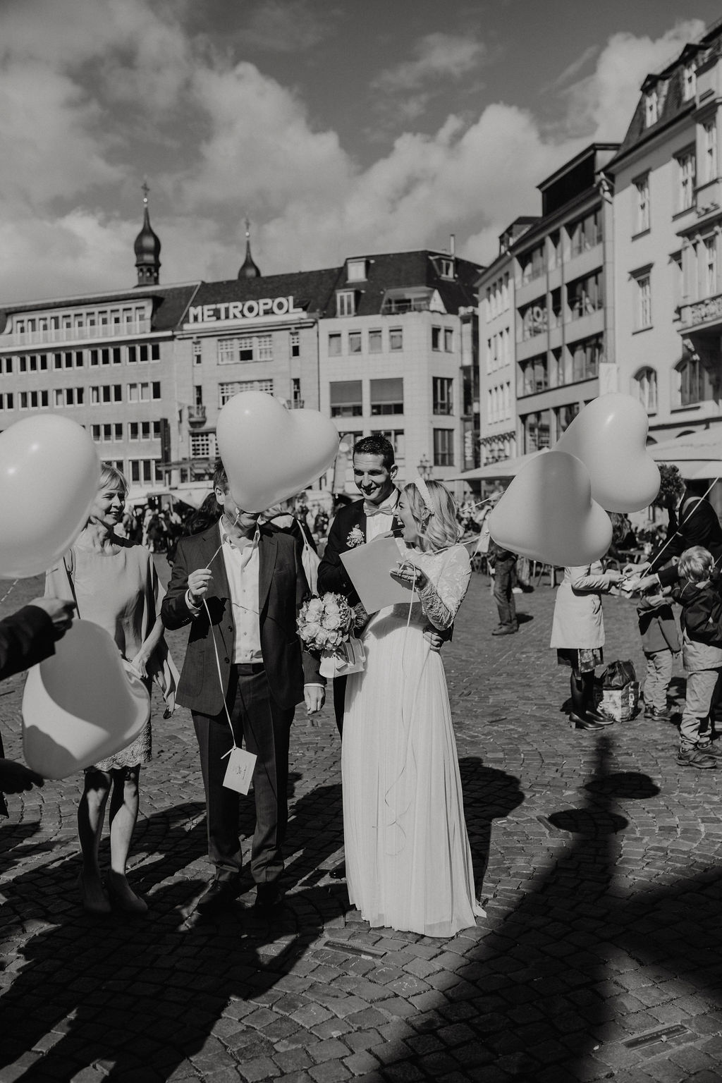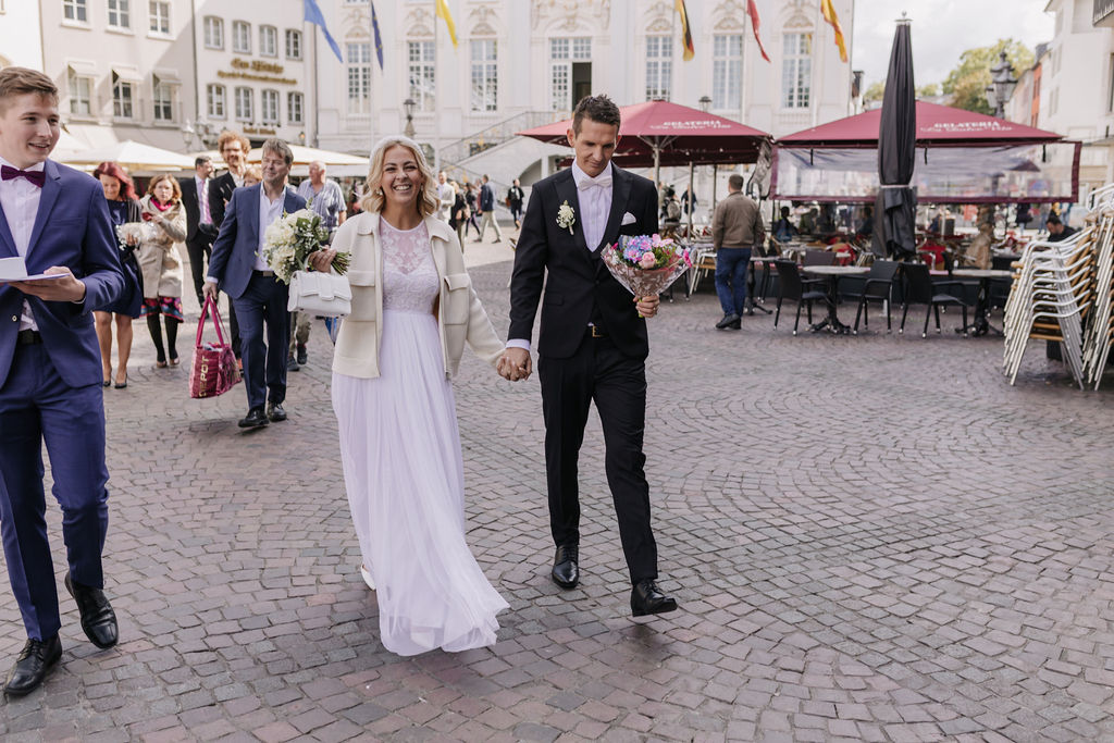 Die Lage des Alten Rathauses ist perfekt für Hochzeitsfotografie in der Stadt: Nach dem Sektempfang bieten sich zahlreiche Fotospots an – von historischen Passagen über kleine Gassen bis hin zu schönen Fassaden und Plätzen, die das Flair Bonns widerspiegeln. Ein kurzer Spaziergang durch die Innenstadt schafft nicht nur eine abwechslungsreiche Bildsprache, sondern auch viele natürliche Begegnungsmomente für das Brautpaar und die Gäste. Ein weiterer Vorteil für Brautpaare und ihre Begleitung ist die Nähe zur Marktgarage, einem zentralen Parkhaus direkt im Zentrum von Bonn – ideal für stressfreies Parken während der Trauung und im Anschluss.