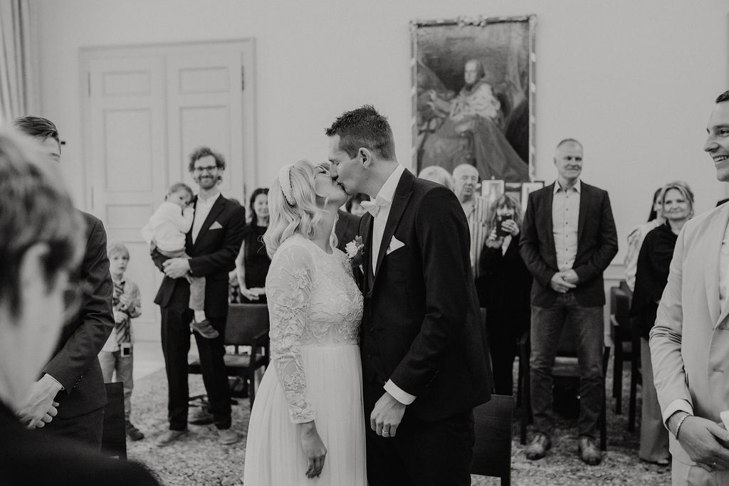 Der Trausaal im Alten Rathaus ist nicht nur elegant eingerichtet, sondern auch überraschend hell und geräumig – ideal für kleine bis mittelgroße Hochzeitsgesellschaften. Sitzplätze und Platz für bis zu etwa 20 – 25 Gäste sind hier möglich, und dank bodentiefer Fenster fällt natürliches Licht in den Raum, was für wunderschöne, natürliche Bilder sorgt.