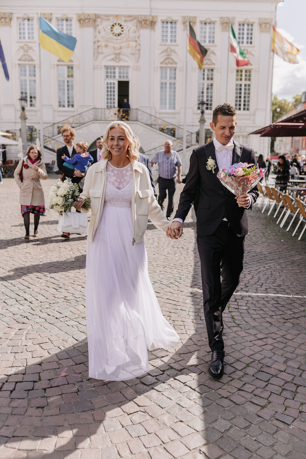 Direkt nach der Trauung versammelten sich alle Gäste auf dem Marktplatz vor dem Alten Rathaus, um Franzi und Fabian mit herzlichen Glückwünschen zu empfangen. Die große Freitreppe, die barocke Fassade und der lebendige Platz bilden ein wunderschönes Setting für Gratulationen und erste Familienfotos mit Dynamik und Stadtflair.